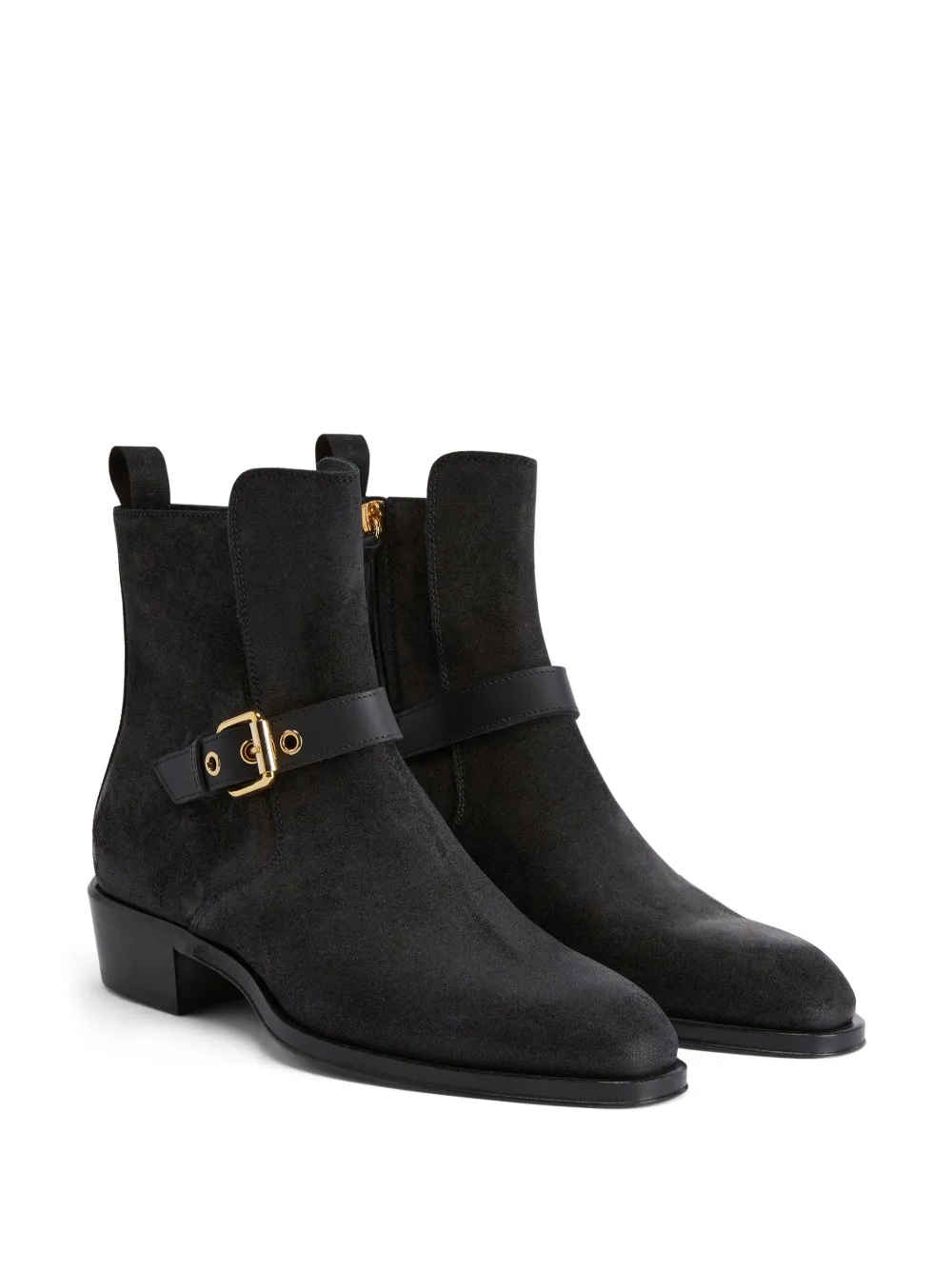 Черный, кожа, застежка на пряжке, кожаный ремешок, миндалевидный носок, застежки на молнии сбоку и высота по щиколотку.
