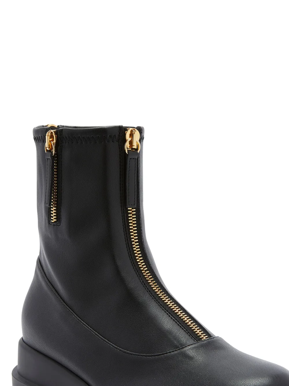 Черный, глянцевая фактура, закругленный носок, высота по щиколотку, короткая застежка на молнии сбоку, застежка на молнии спереди, застежка на молнии сзади и рифленая резиновая подошва.