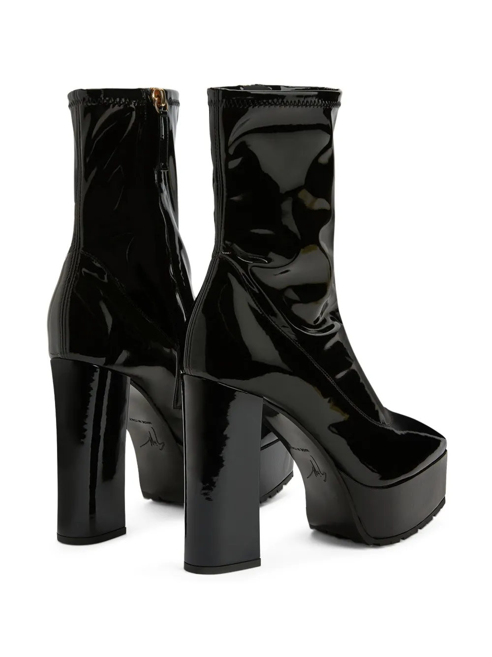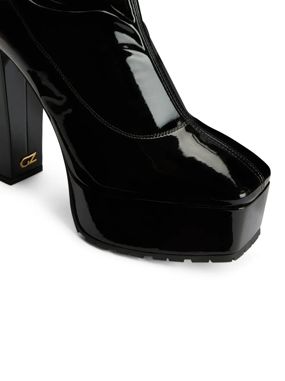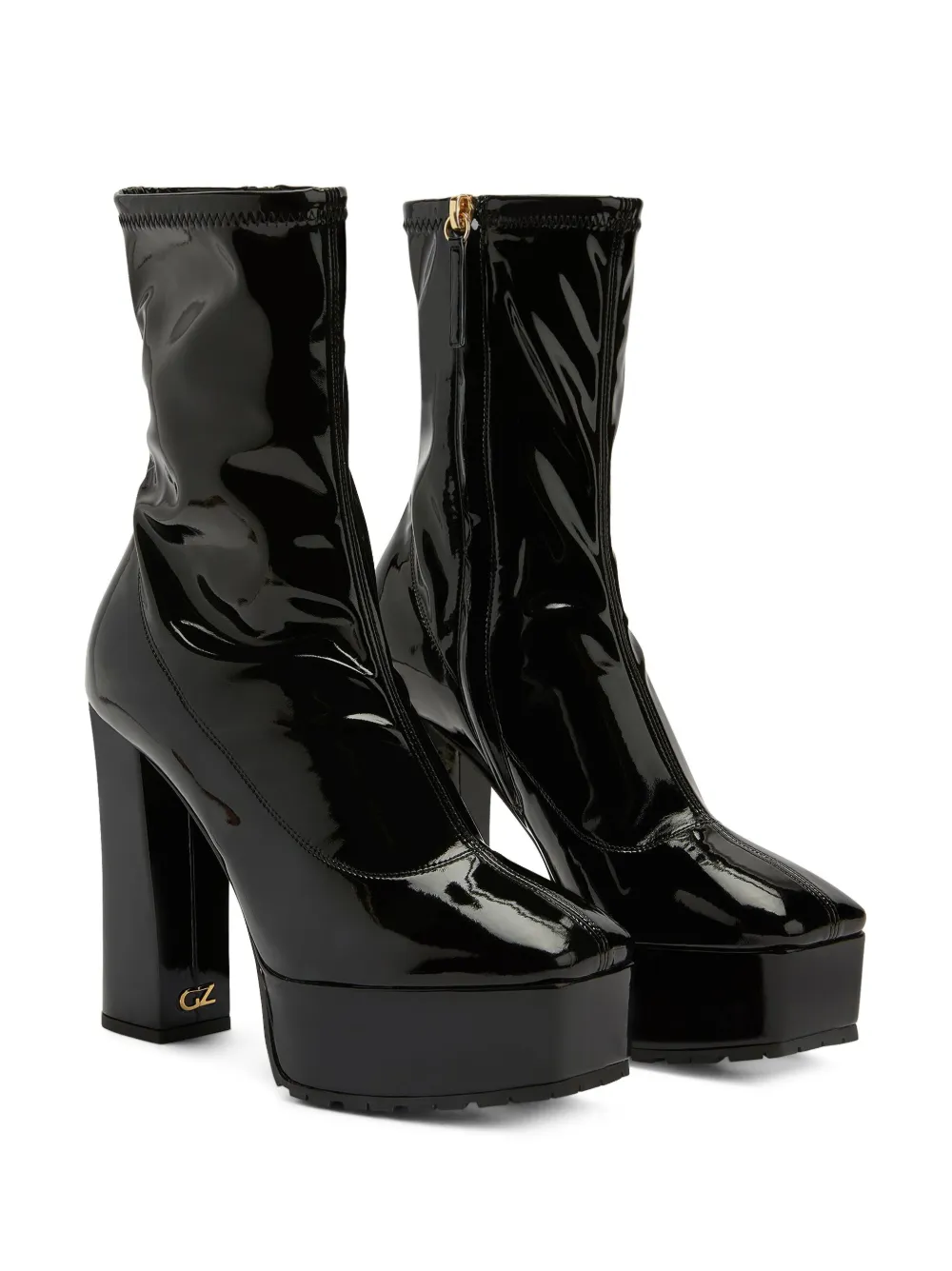 Черный, кожа, логотип на подошве, золотистый металлический логотип, квадратный носок, застежка на молнии сбоку, подошва на платформе и высокий блочный каблук.