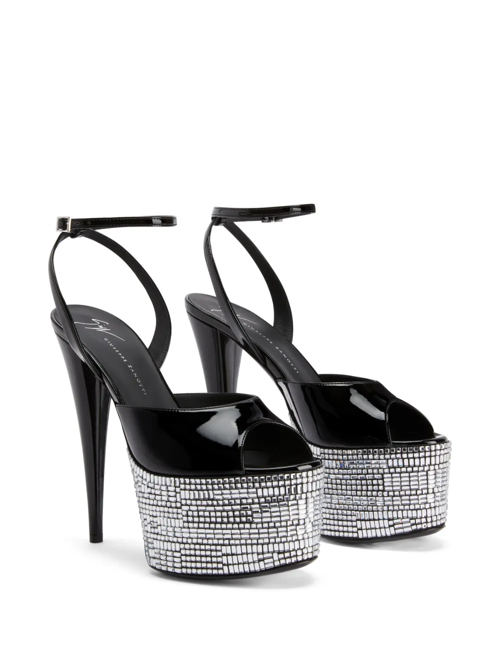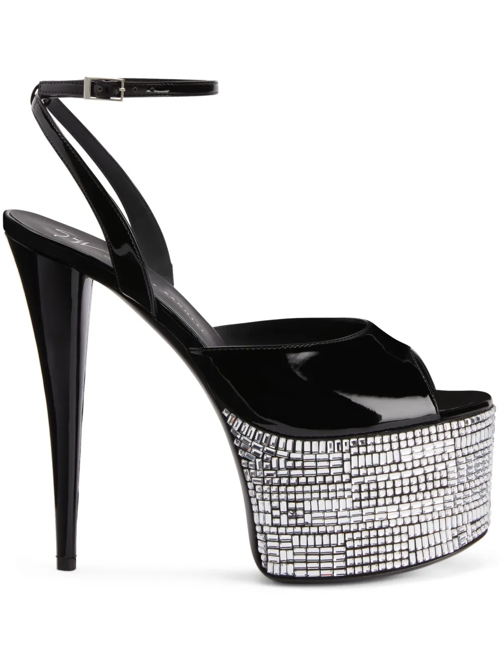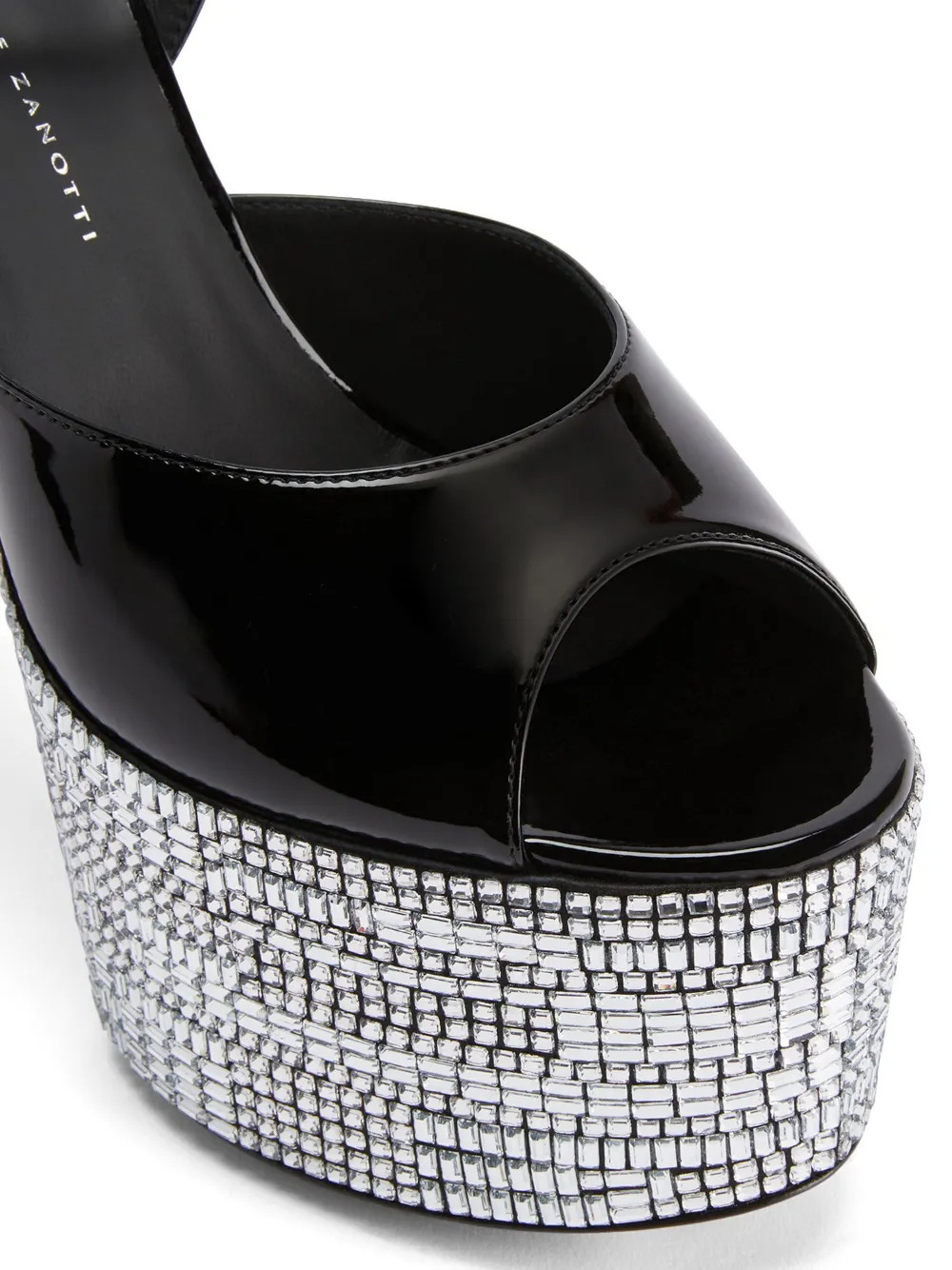 Черный, кожа, лакированная отделка, декор из кристаллов, открытый носок, ремешок на щиколотке с пряжкой, подошва на платформе, высокий каблук в форме конуса и стелька с логотипом.