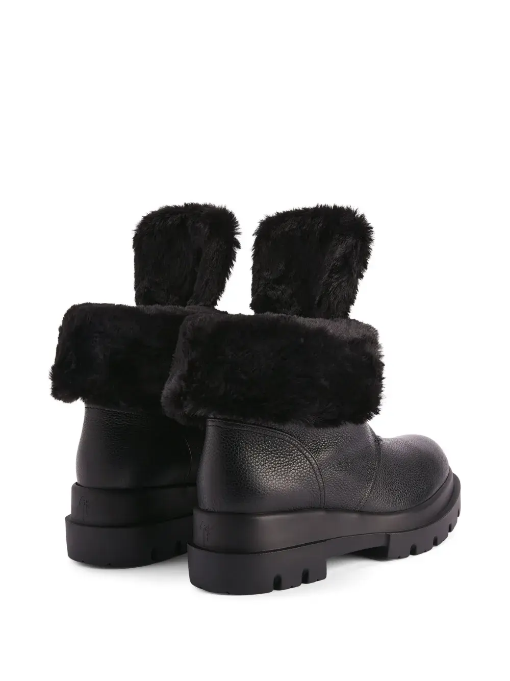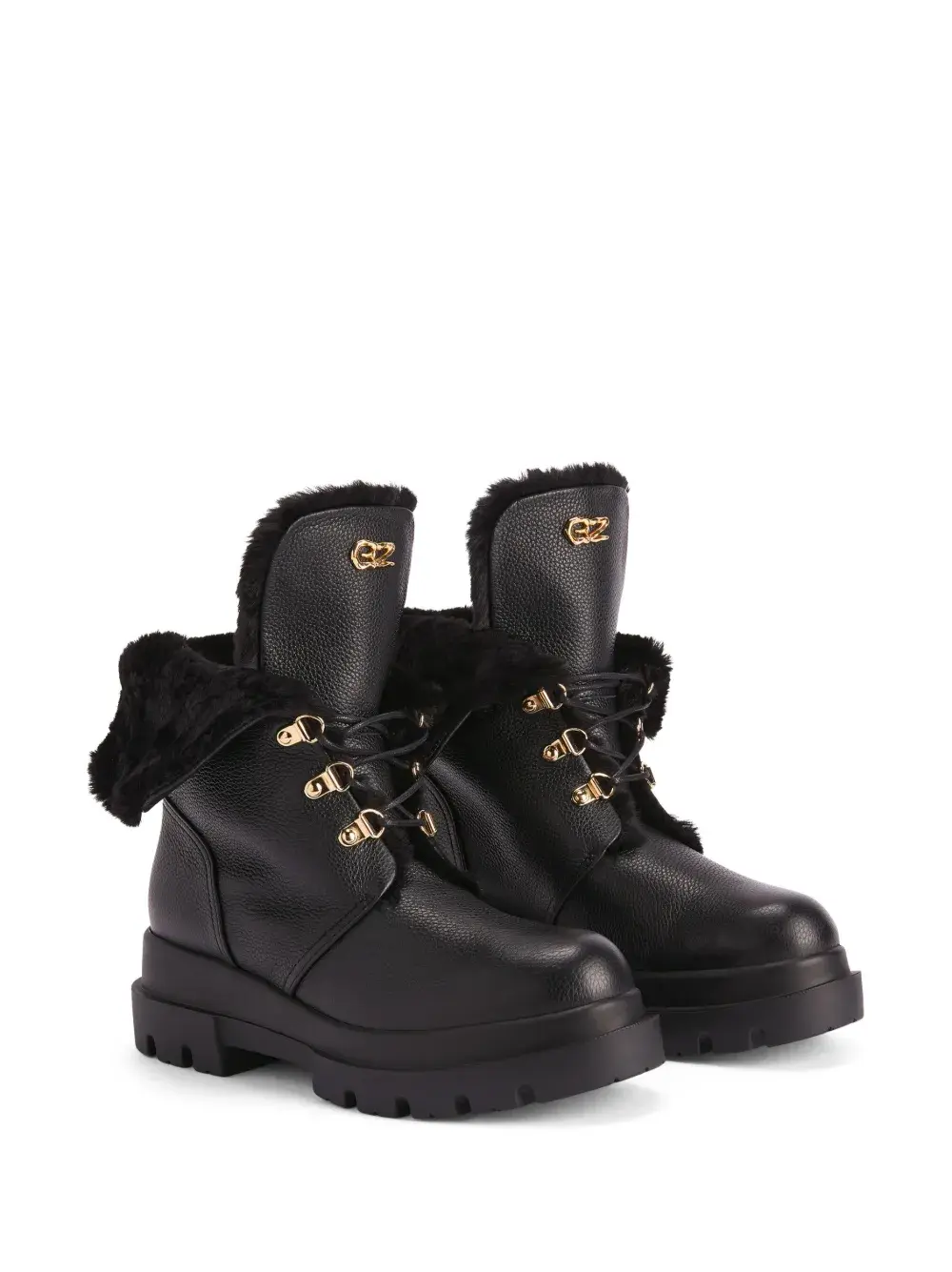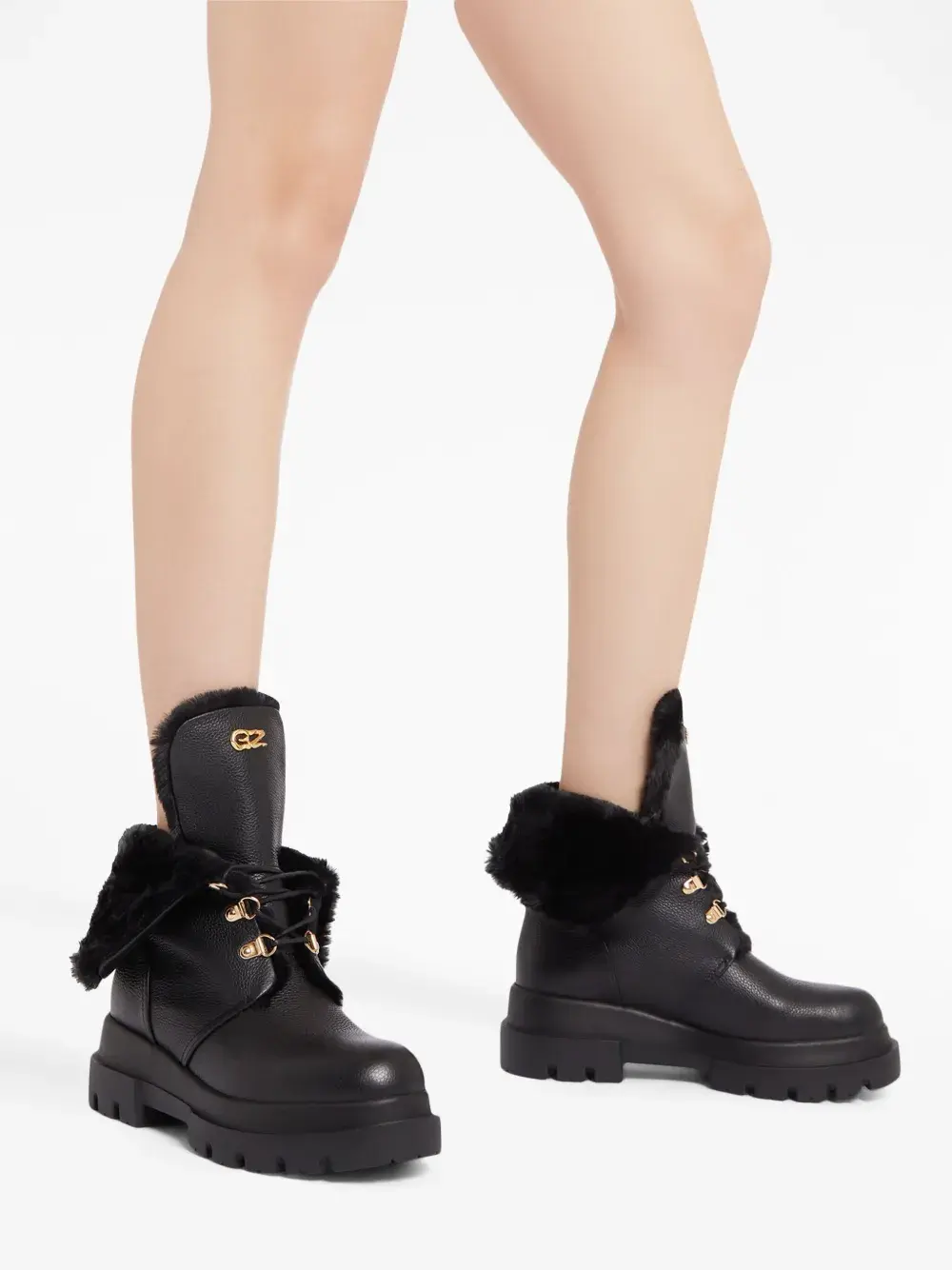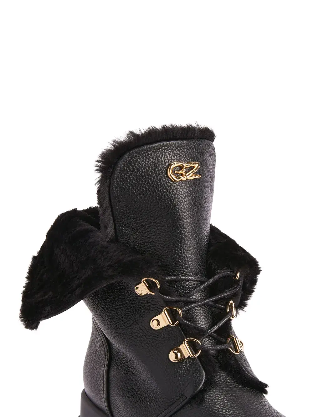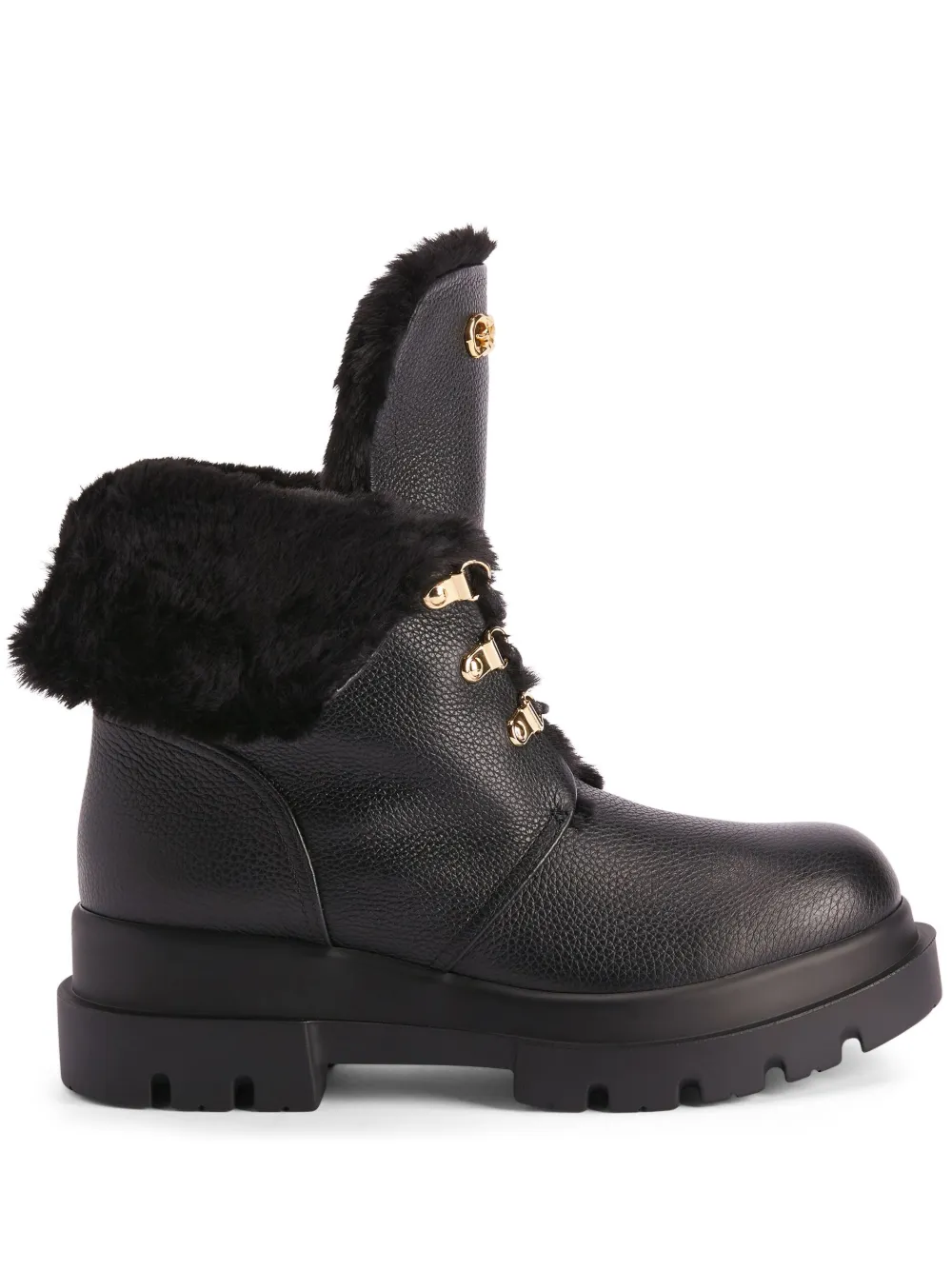 Черный, кожа, зернистая текстура, подкладка из искусственного меха, золотистый металлический логотип, золотистая фурнитура, закругленный носок, шнуровка спереди, высота по щиколотку и массивная резиновая подошва.