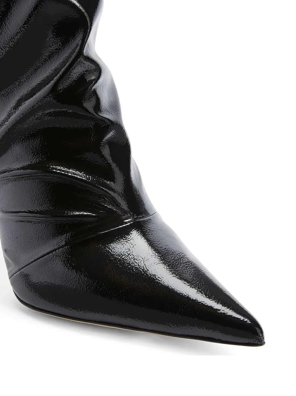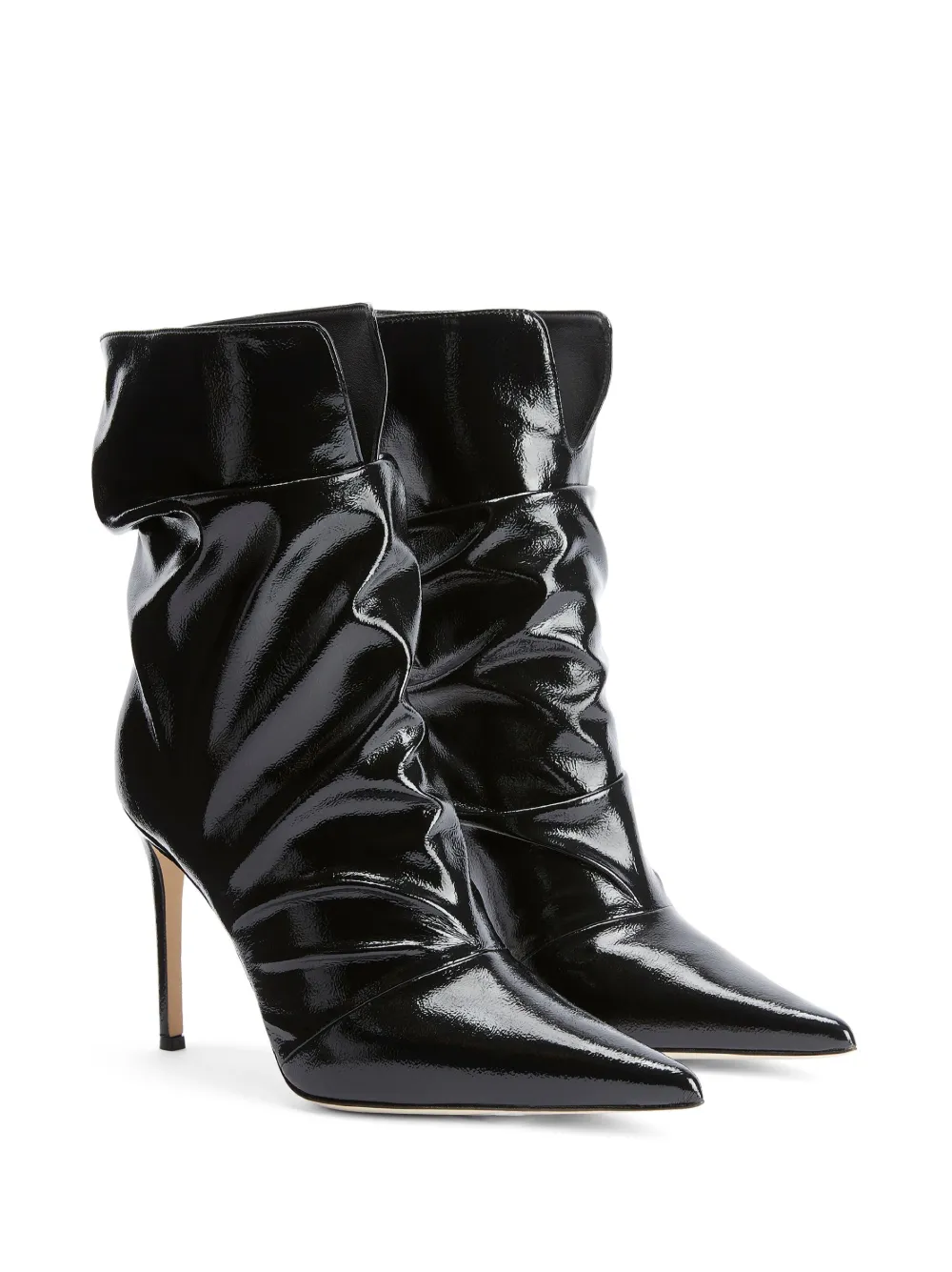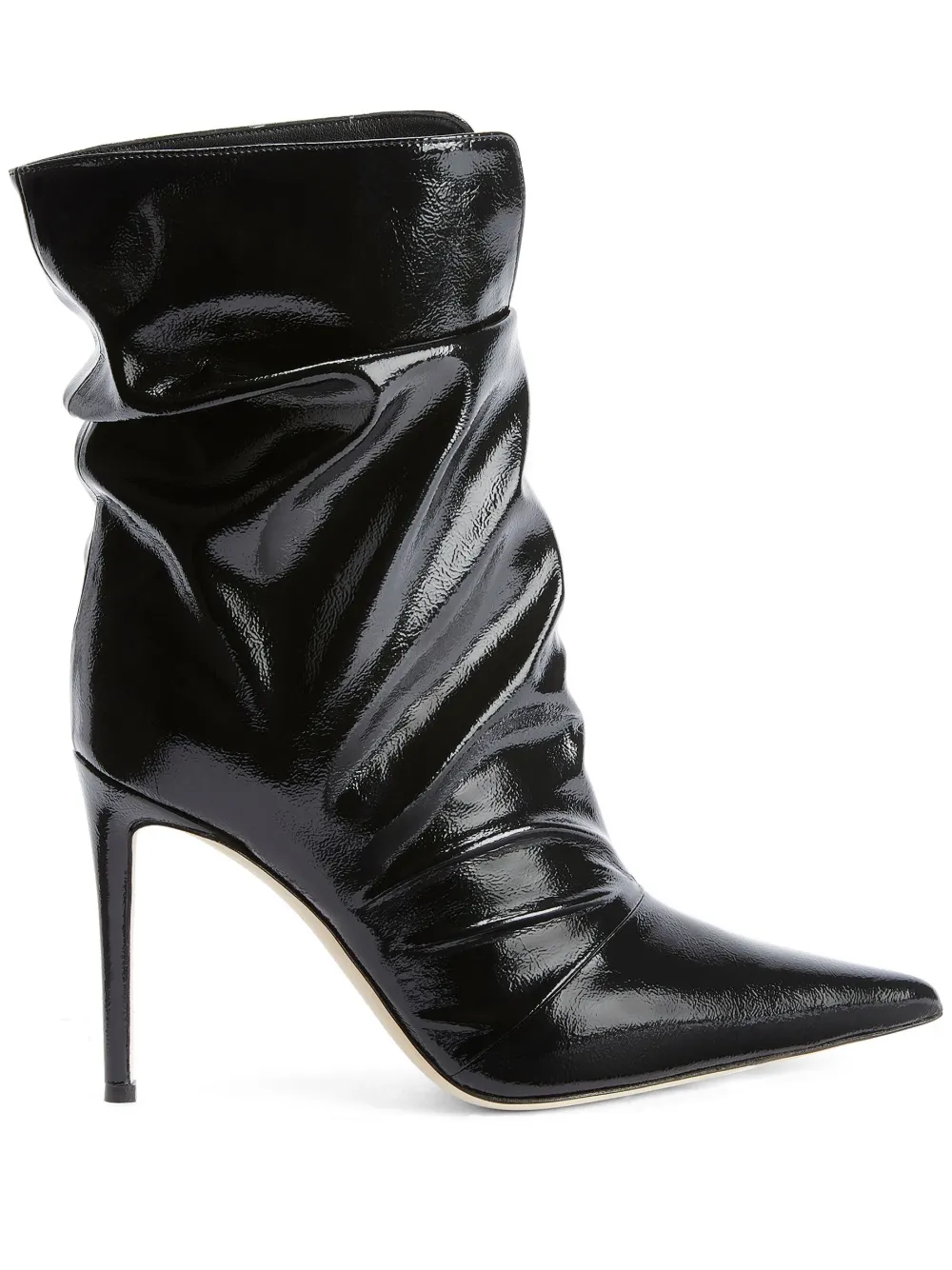 Черный, кожа, лакированная отделка, объемная модель, дизайн со сборками, заостренный носок, модель без застежки, каблук на высокой шпильке и высота по щиколотку.