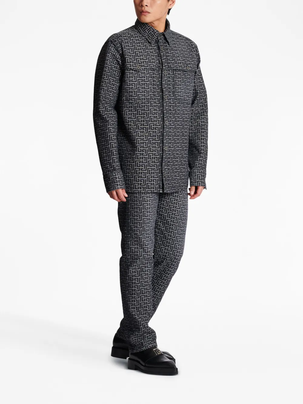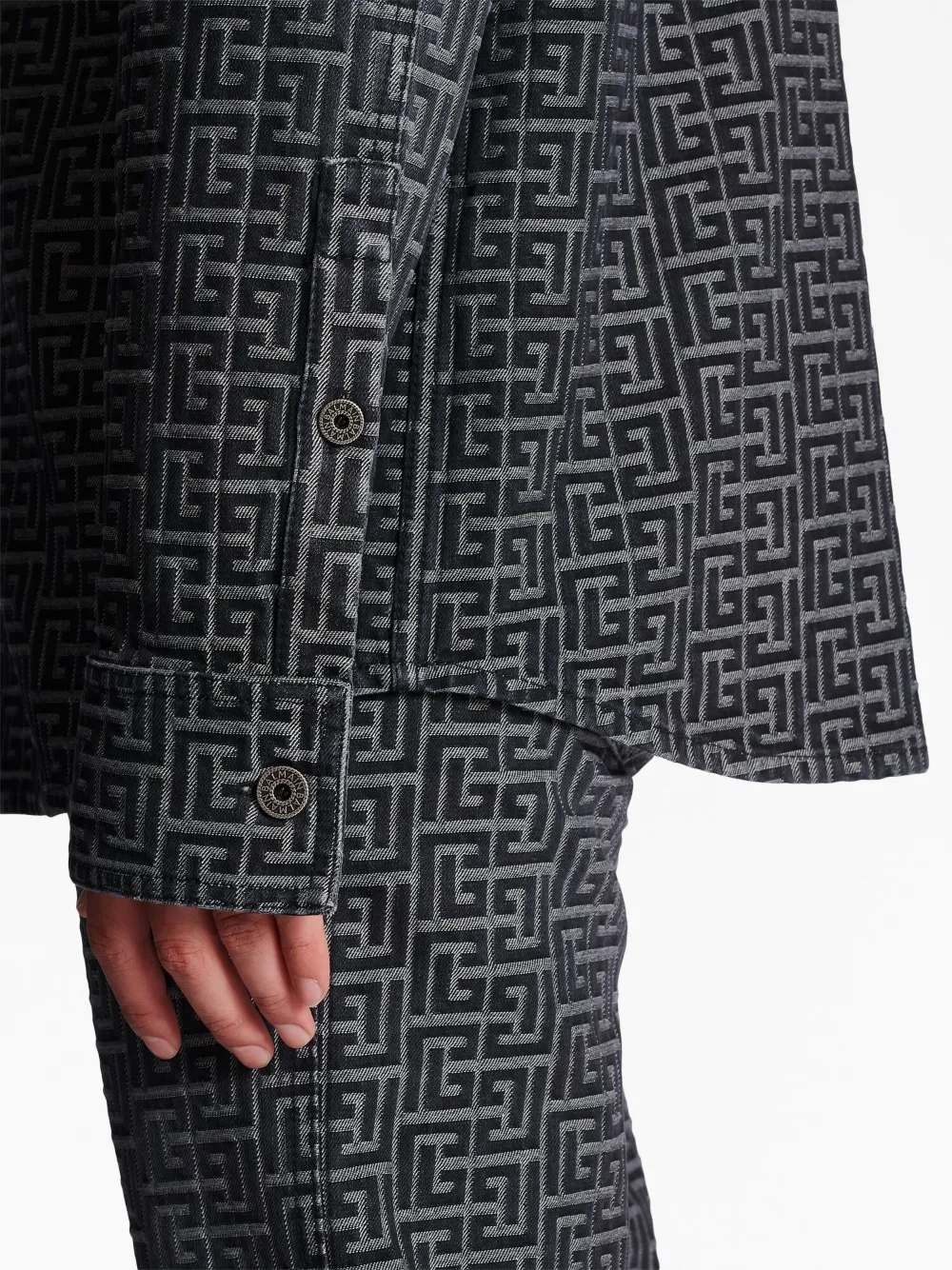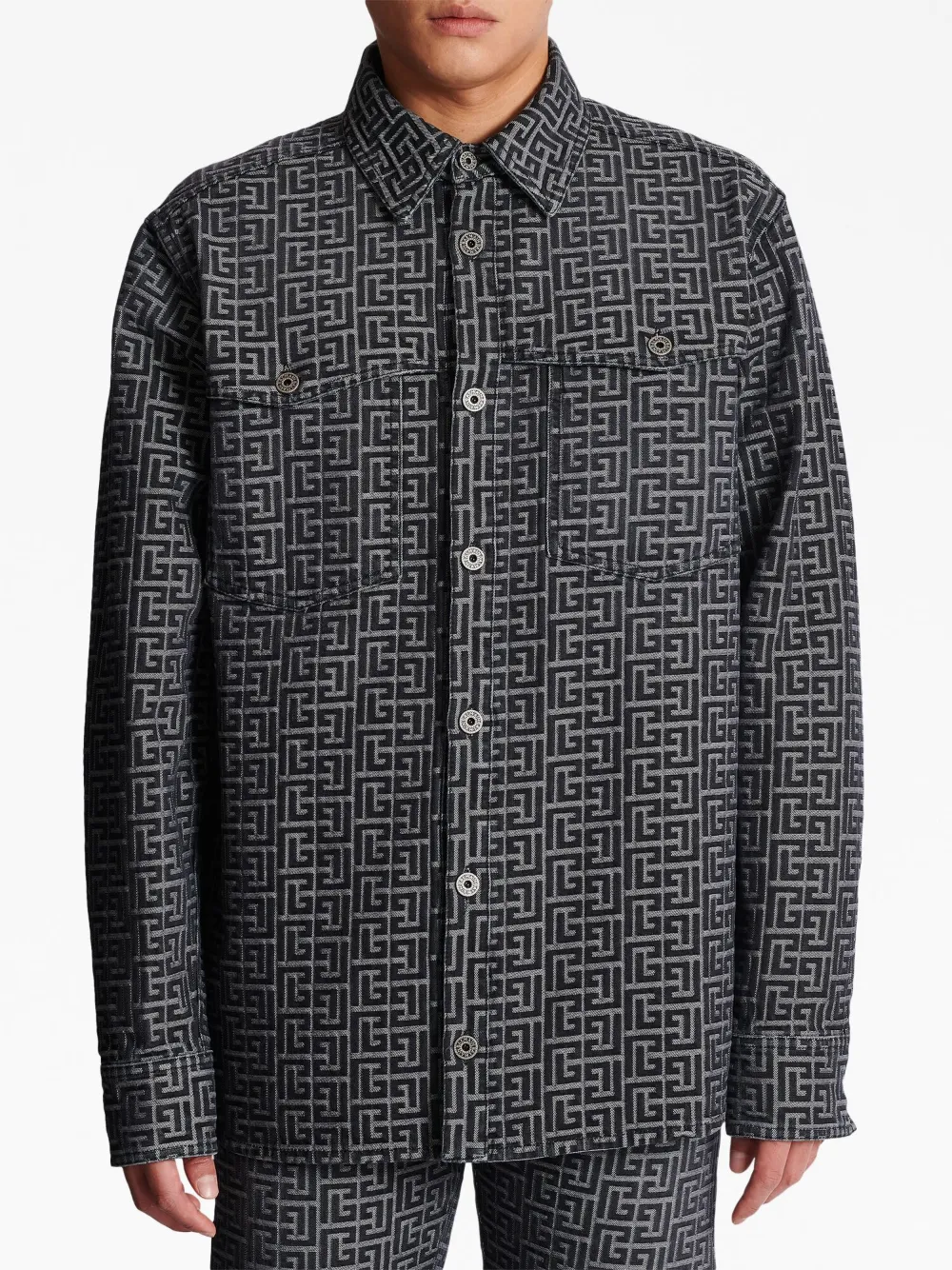 Черный, деним, жаккард с монограммой, классический воротник, застежка на пуговицах спереди, длинные рукава и манжеты на пуговицах.
