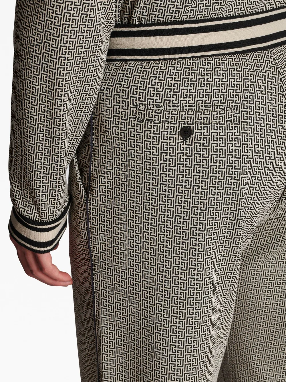 Черный, бежевый, жаккард с монограммой, эластичный пояс, кулиска на талии, прямой крой, два кармана по бокам и два прорезных кармана на пуговицах сзади.