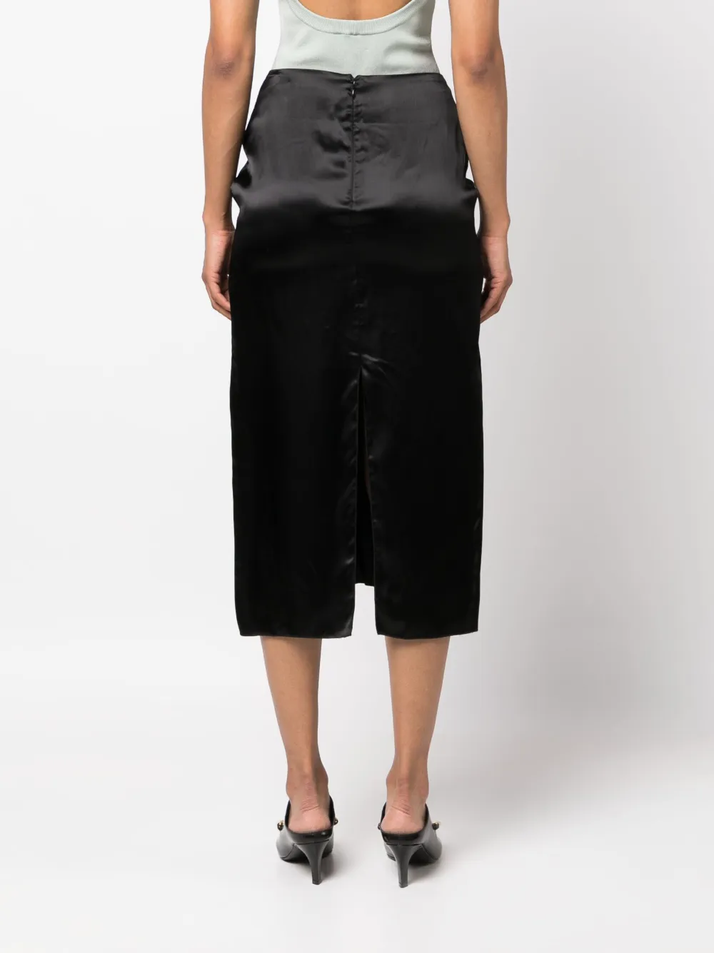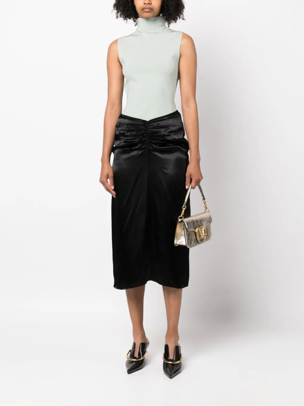 Черный, сатиновая фактура, дизайн со сборками, завышенная линия талии, вырез сзади и длина миди.