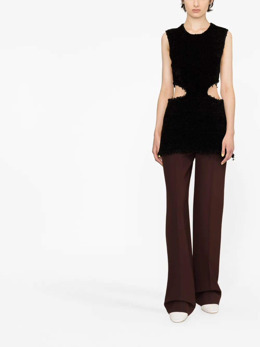 Черный, круглый вырез, без рукавов и вырезные детали.