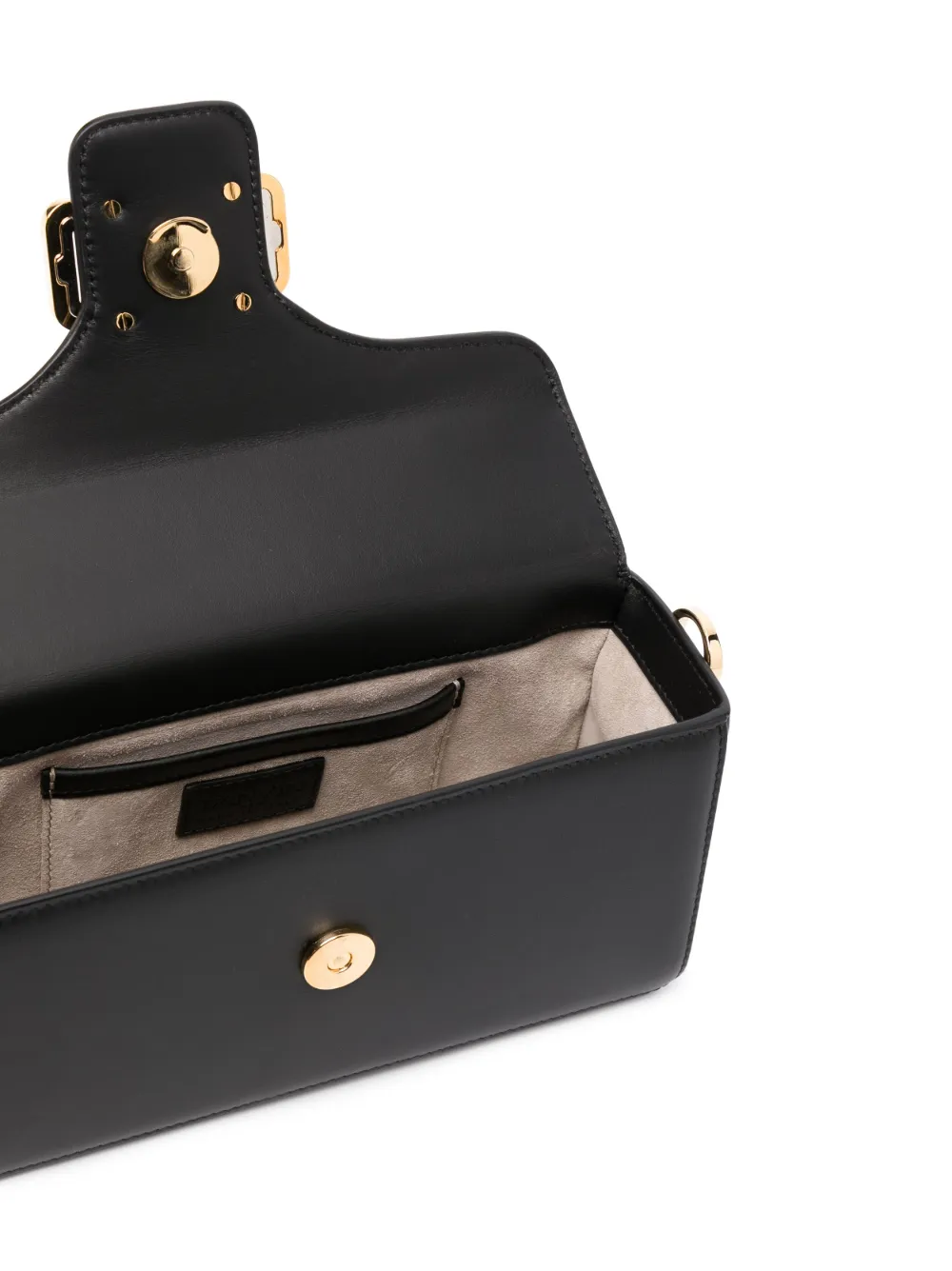 Черный, телячья кожа, украшения из горного хрусталя, золотистая фурнитура, откидной клапан на магните, ремень на плечо и внутренний прорезной карман.