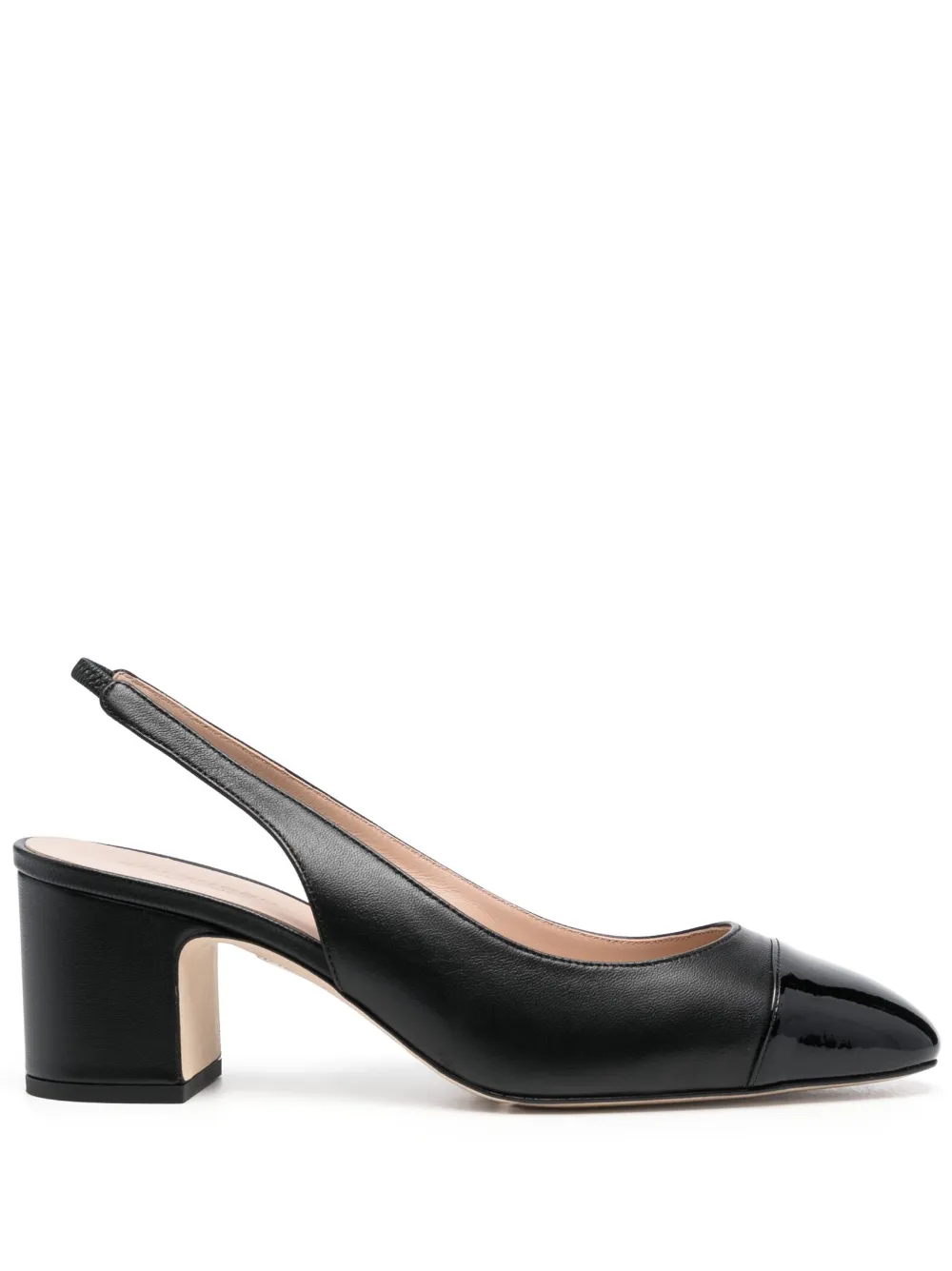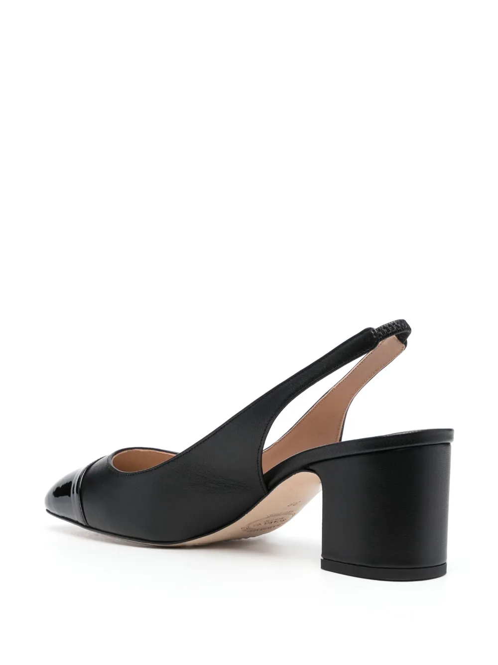 Черный, телячья кожа, эластичный ремешок на пятке, миндалевидный носок, блочный каблук и модель без застежки.