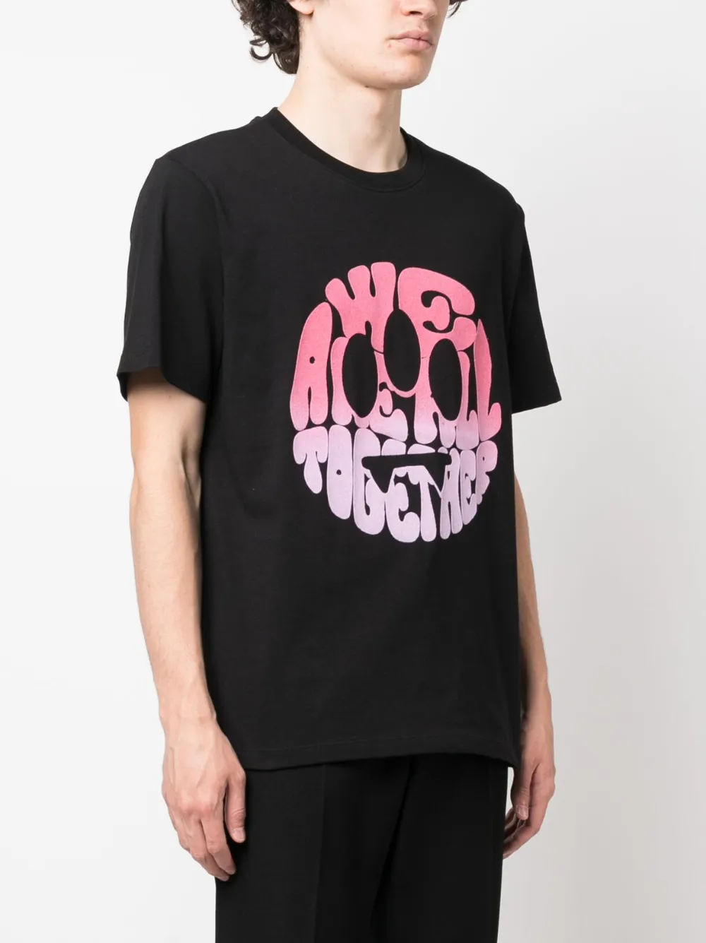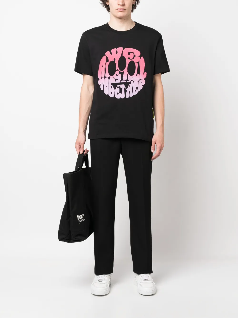 Черный, хлопок, графичный принт спереди, принт с логотипом сзади, круглый вырез, короткие рукава и прямой подол.