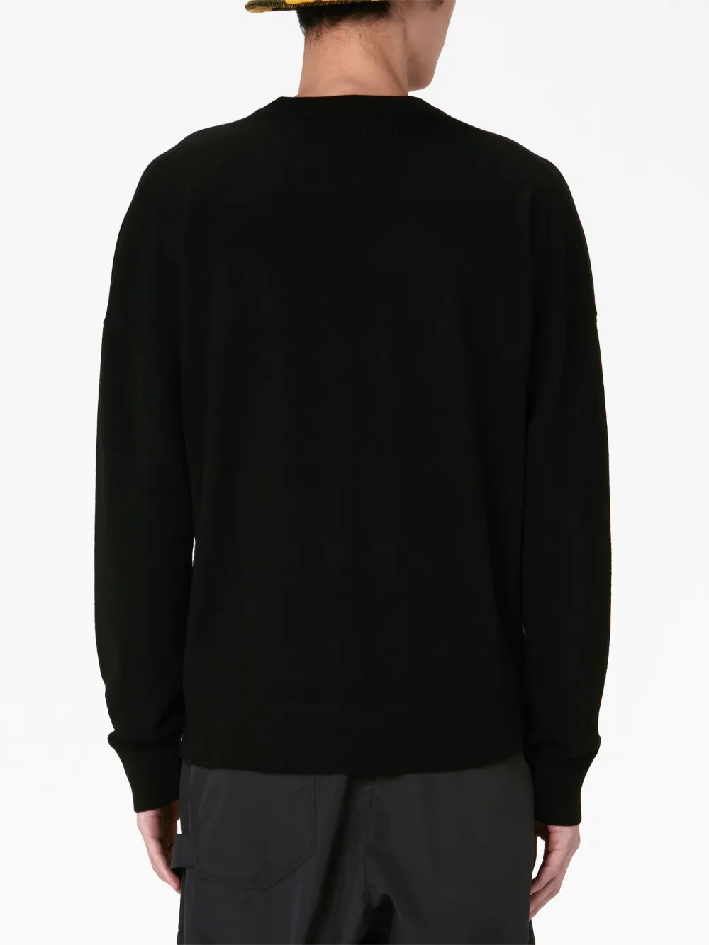 Черный, шерсть мериноса, трикотажный материал, анималистичный принт, круглый вырез, длинные рукава и прямой подол. Это унисекс-модель. Обратите внимание, что для нее используется мужская размерная сетка.