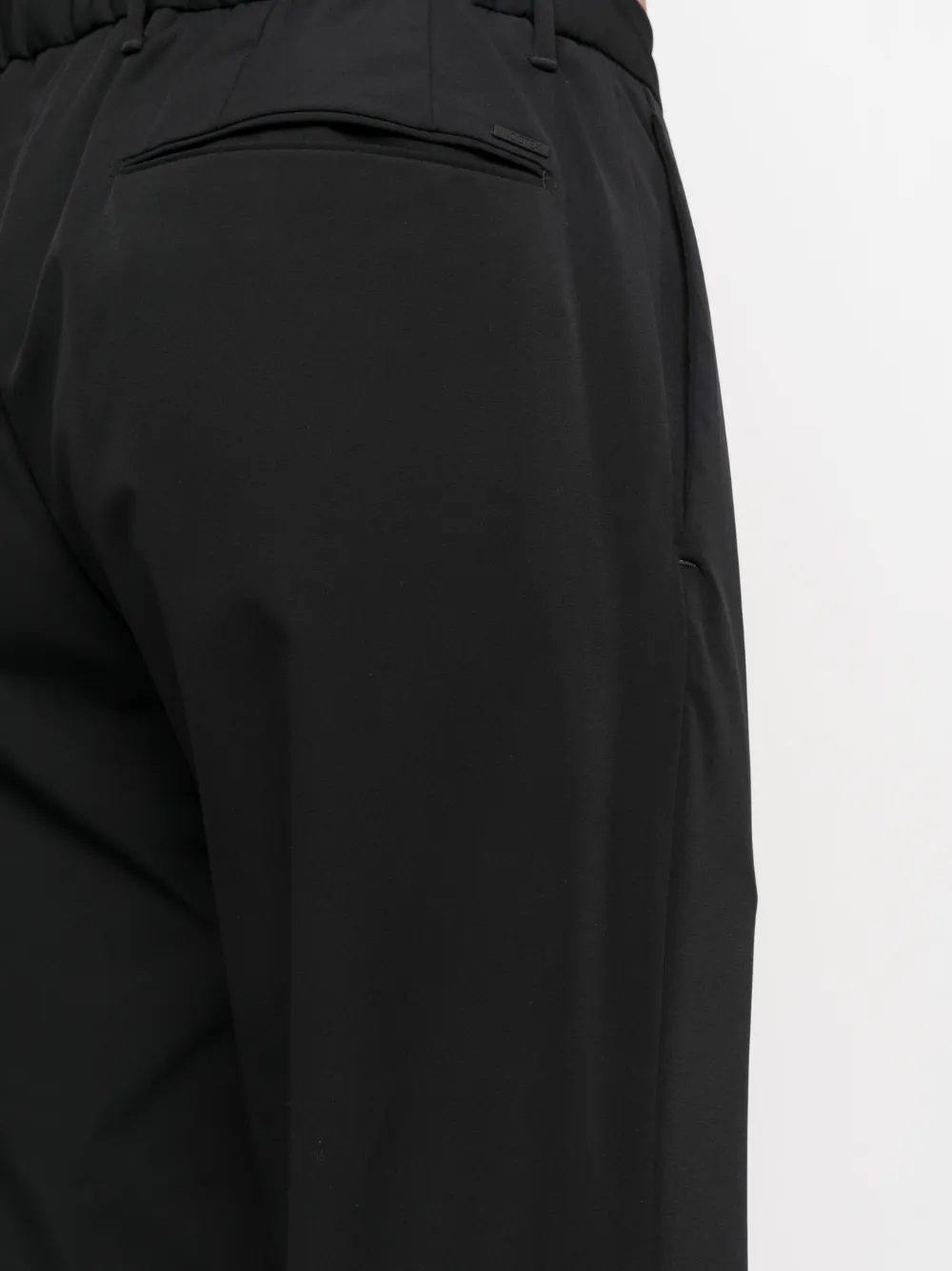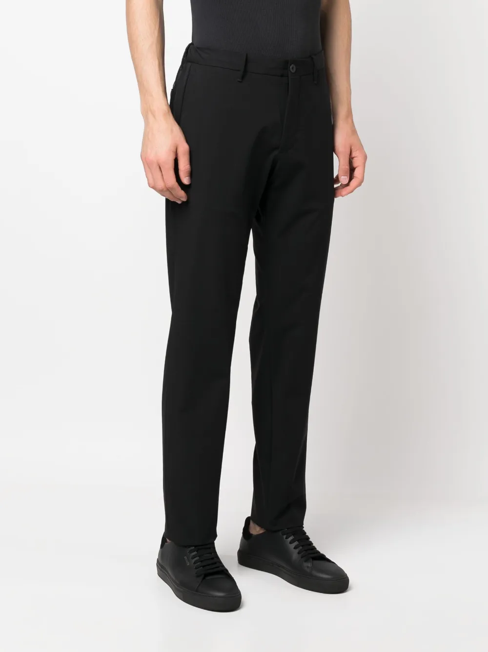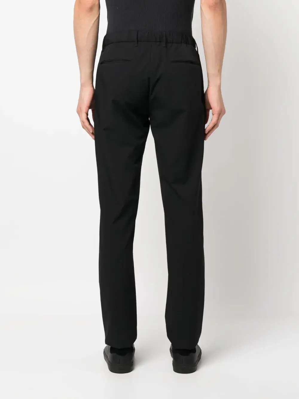 Черный, эластичный материал, петли для ремня, эластичный пояс сзади, застежка на молнии и пуговице спереди, прямой крой, два вшитых кармана по бокам и два кармана с листочкой сзади.