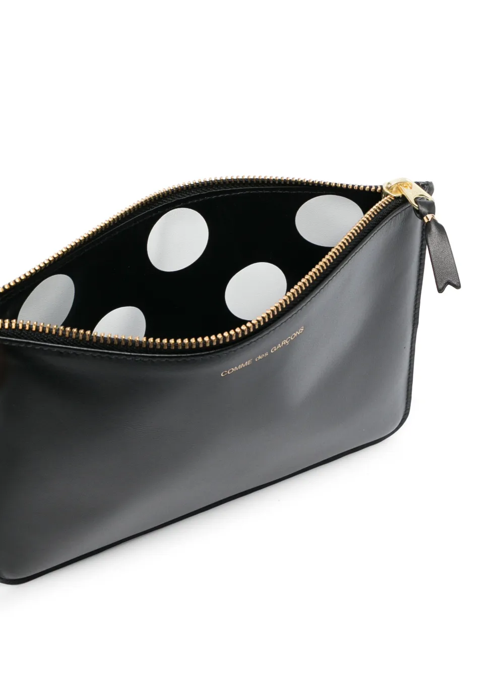Черный, телячья кожа, гладкая текстура кожи, логотип спереди, золотистый логотип, застежка на молнии сверху, принт в горох и основное отделение.