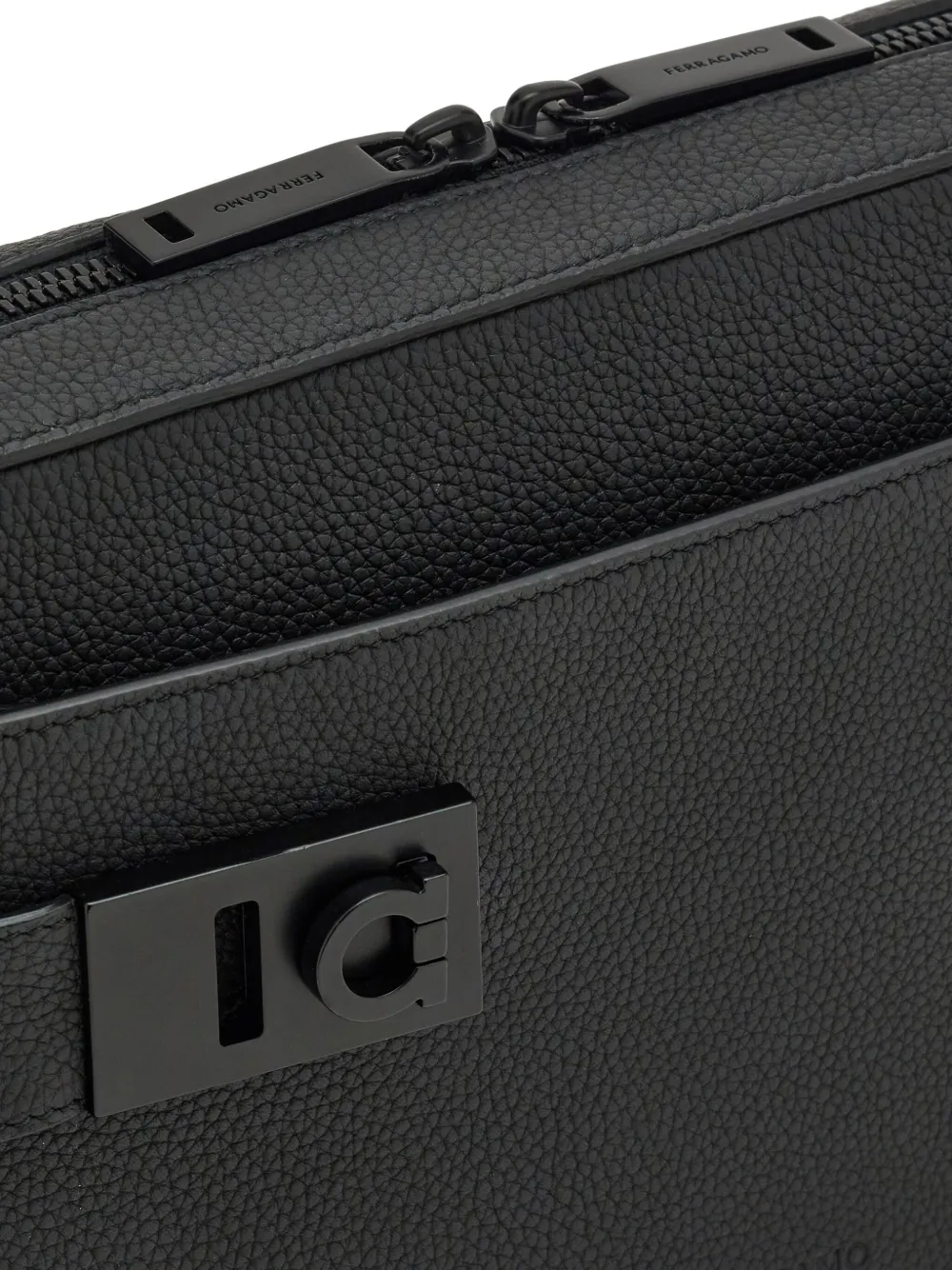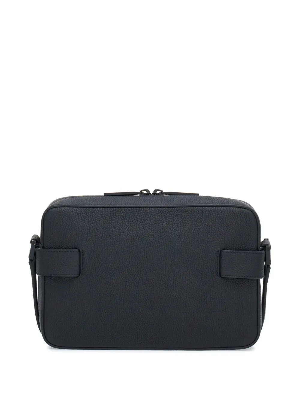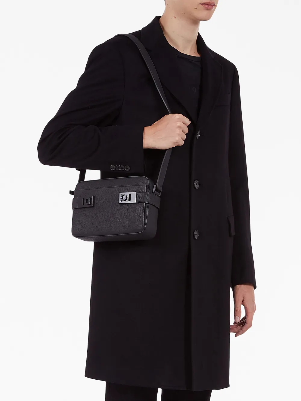 Черный, телячья кожа, зернистая текстура, тисненый логотип спереди, нашивка с логотипом внутри, пряжка Gancini, строчка в тон, застежка на молнии сверху, регулируемый ремень на плечо, прорезной карман спереди, внутренний карман на молнии и основное отделение.