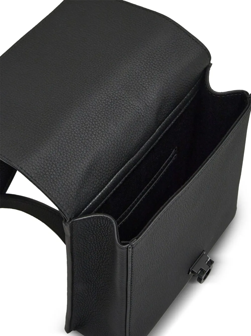 Черный, телячья кожа, зернистая текстура, асимметричная форма, карман на молнии спереди, регулируемый ремень на плечо, откидной клапан, застежка на зажиме, внутренний прорезной карман и основное отделение.