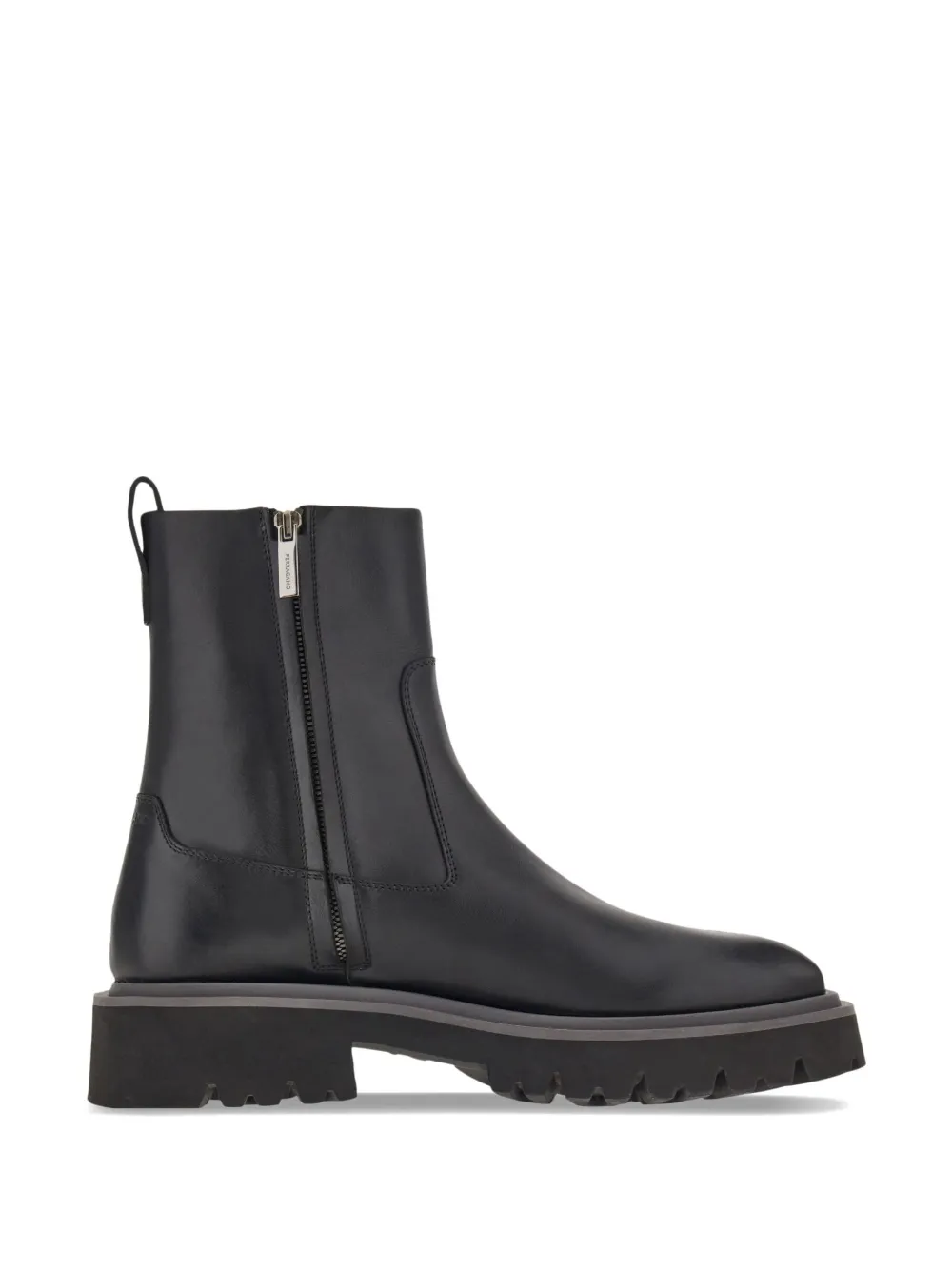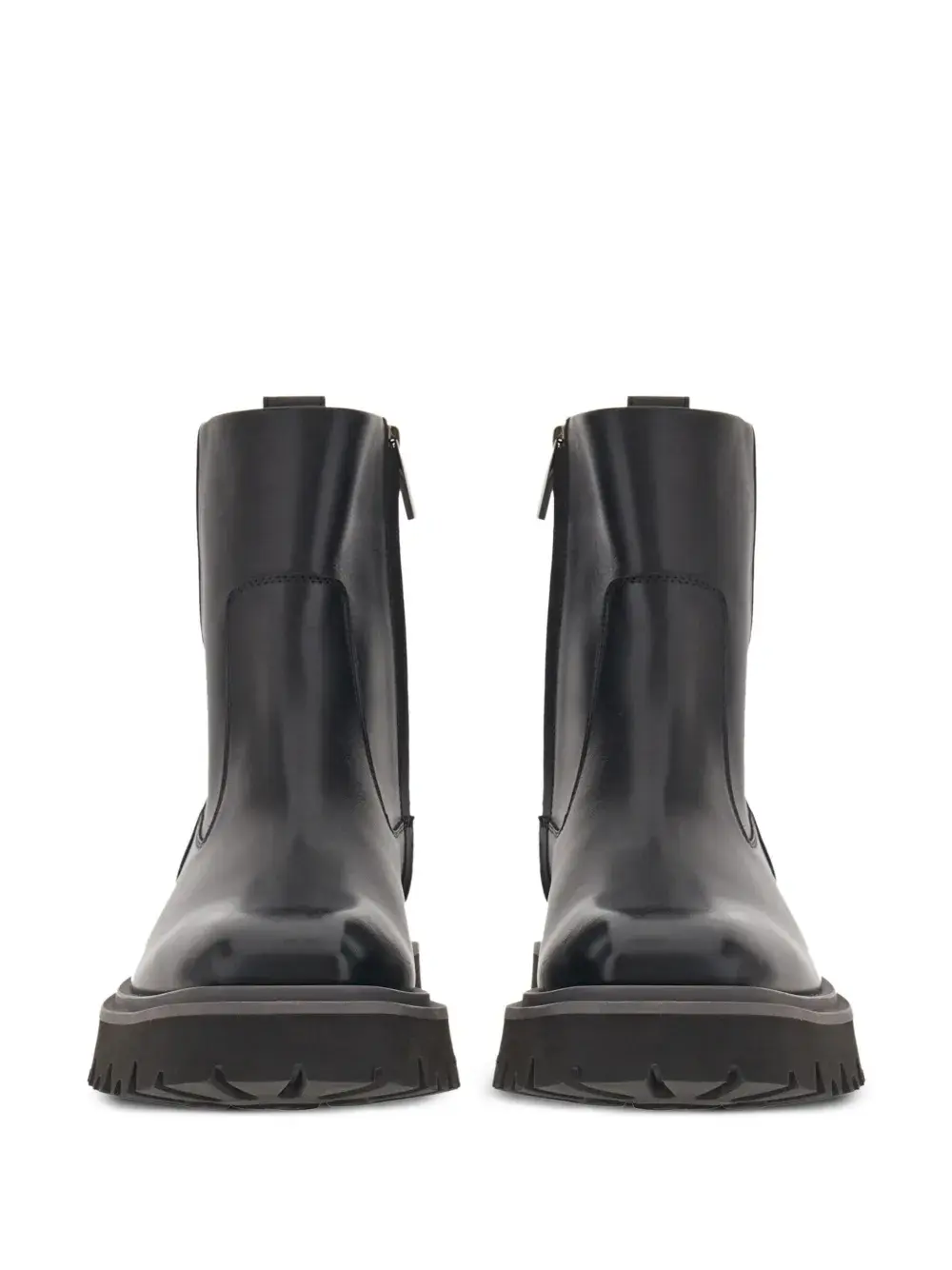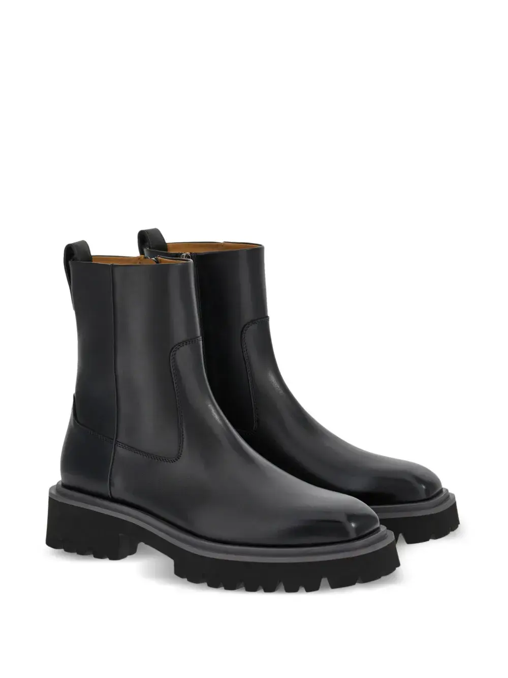 Черный, телячья кожа, застежка на молнии сбоку, миндалевидный носок, высота по щиколотку, петля для подтягивания сзади и массивная резиновая подошва c протектором.