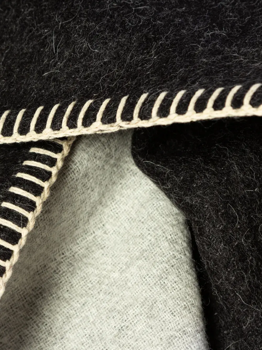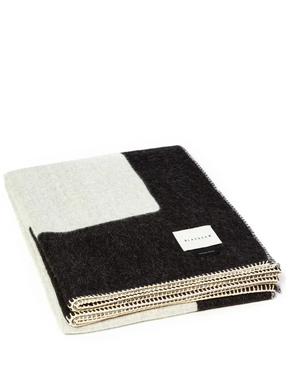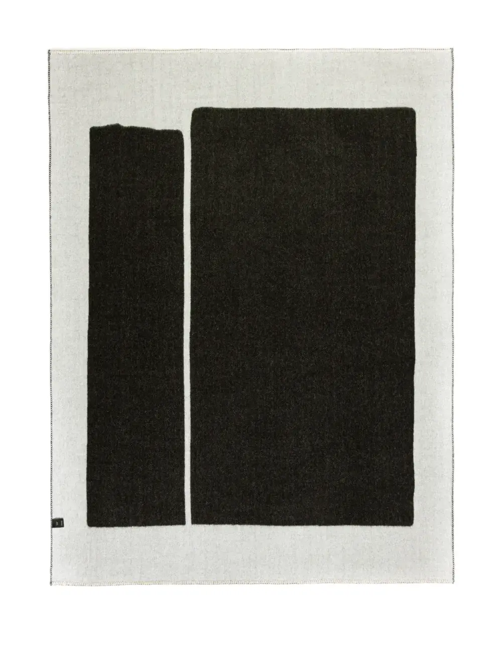 Черный, цвет слоновой кости, шерсть альпака, геометричный принт, нашивка с логотипом спереди, бирка с логотипом, двусторонний дизайн, прямоугольная форма и обметочный шов.