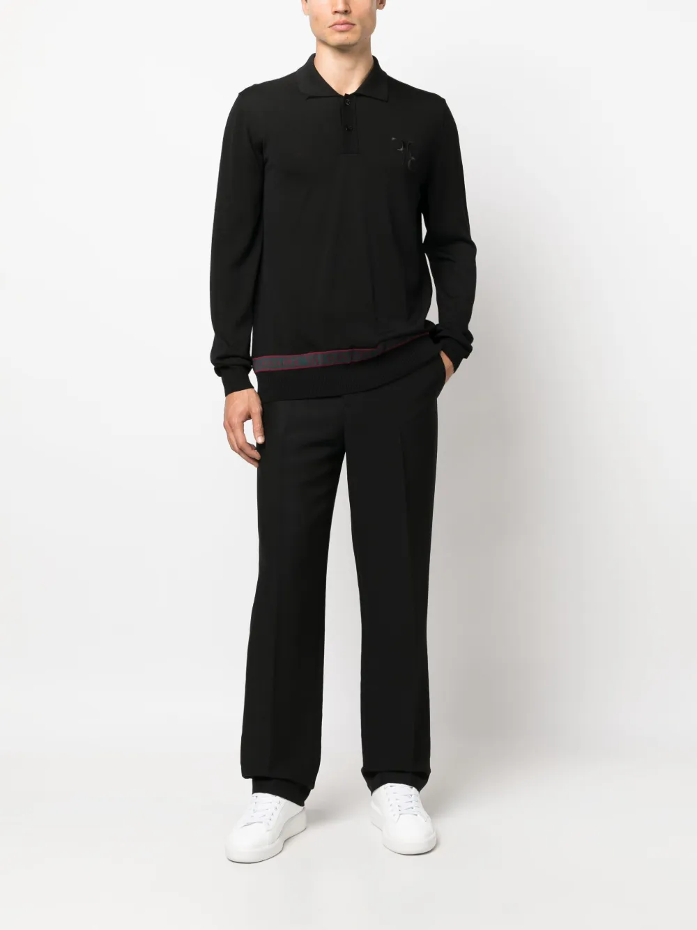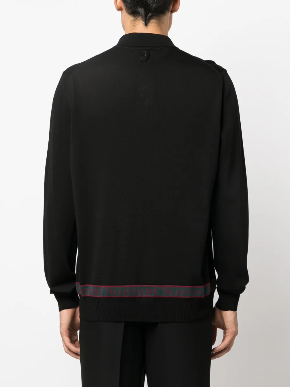 Черный, шерсть мериноса, смесовый шелк, вышитый логотип на груди, логотип в технике интарсия, воротник поло, длинные рукава, планка на пуговицах спереди и прямой подол.