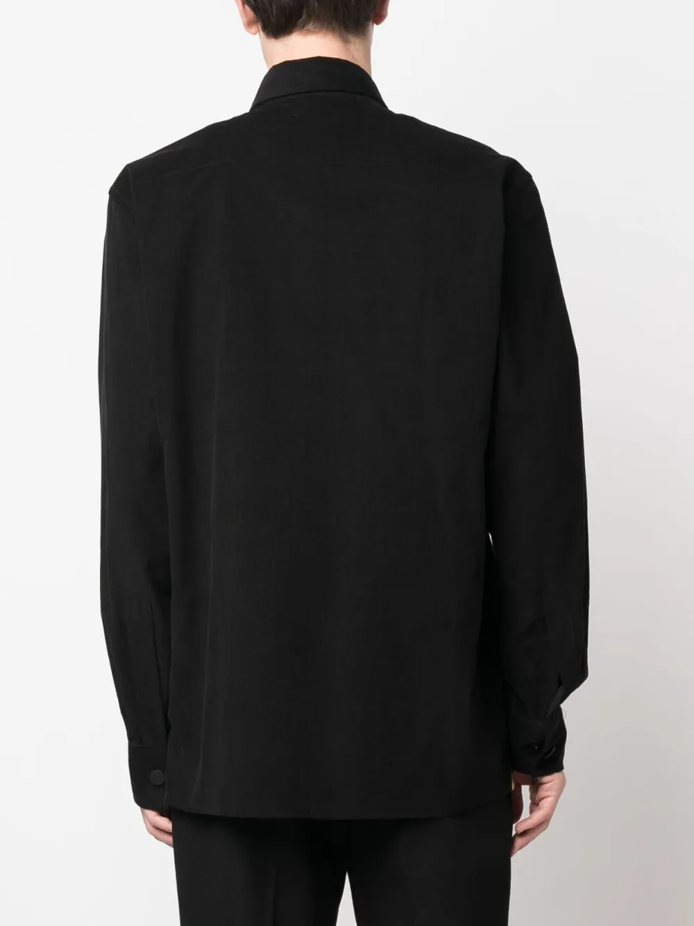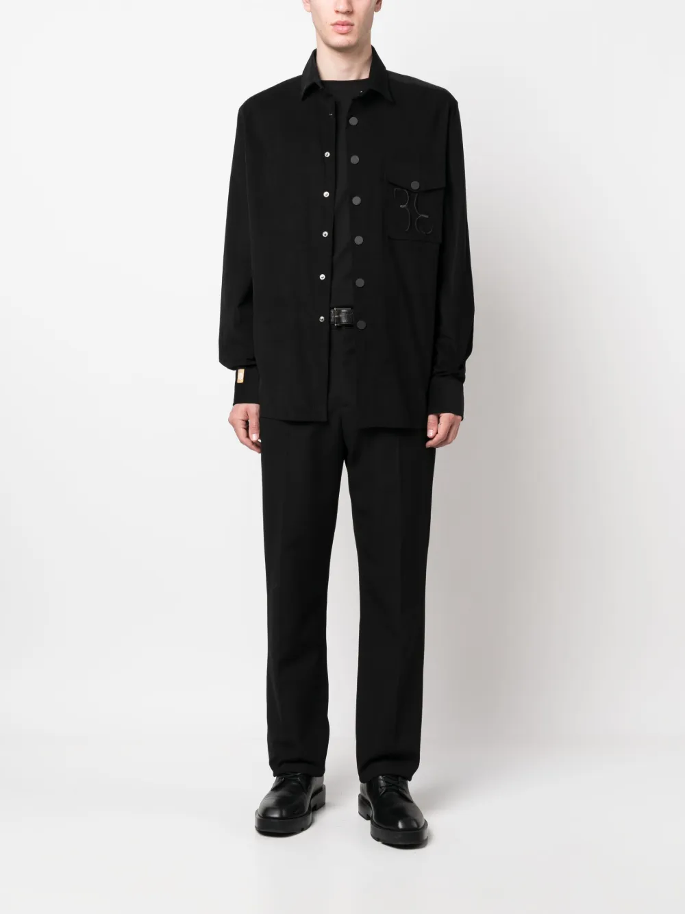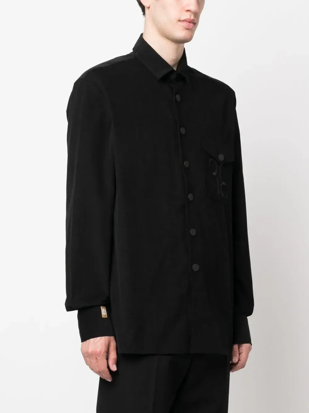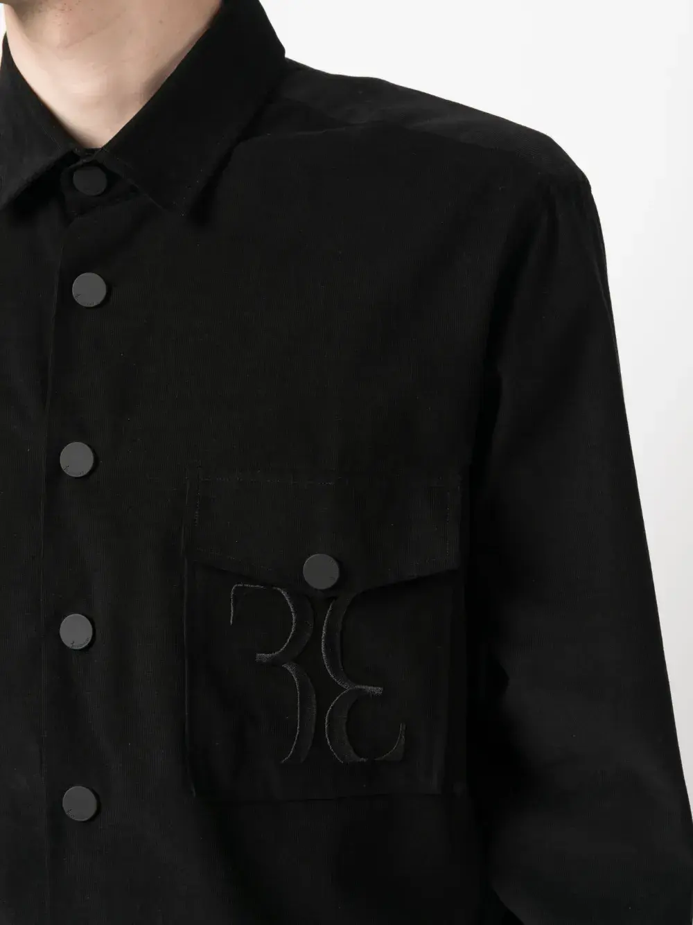 Черный, хлопок, вышитый логотип на груди, классический воротник, застежка на кнопках спереди, длинные рукава, манжеты на пуговицах и прямой подол.
