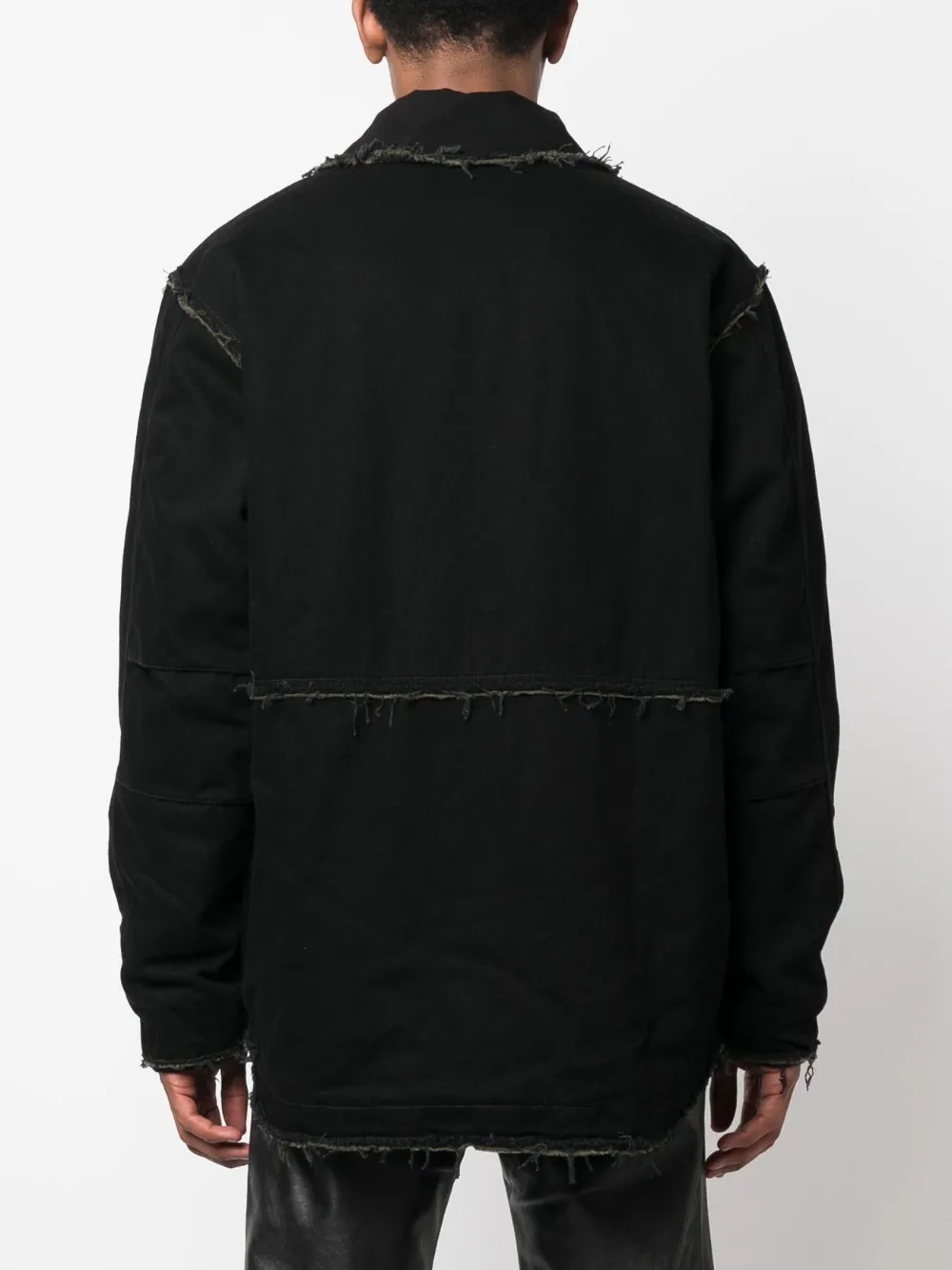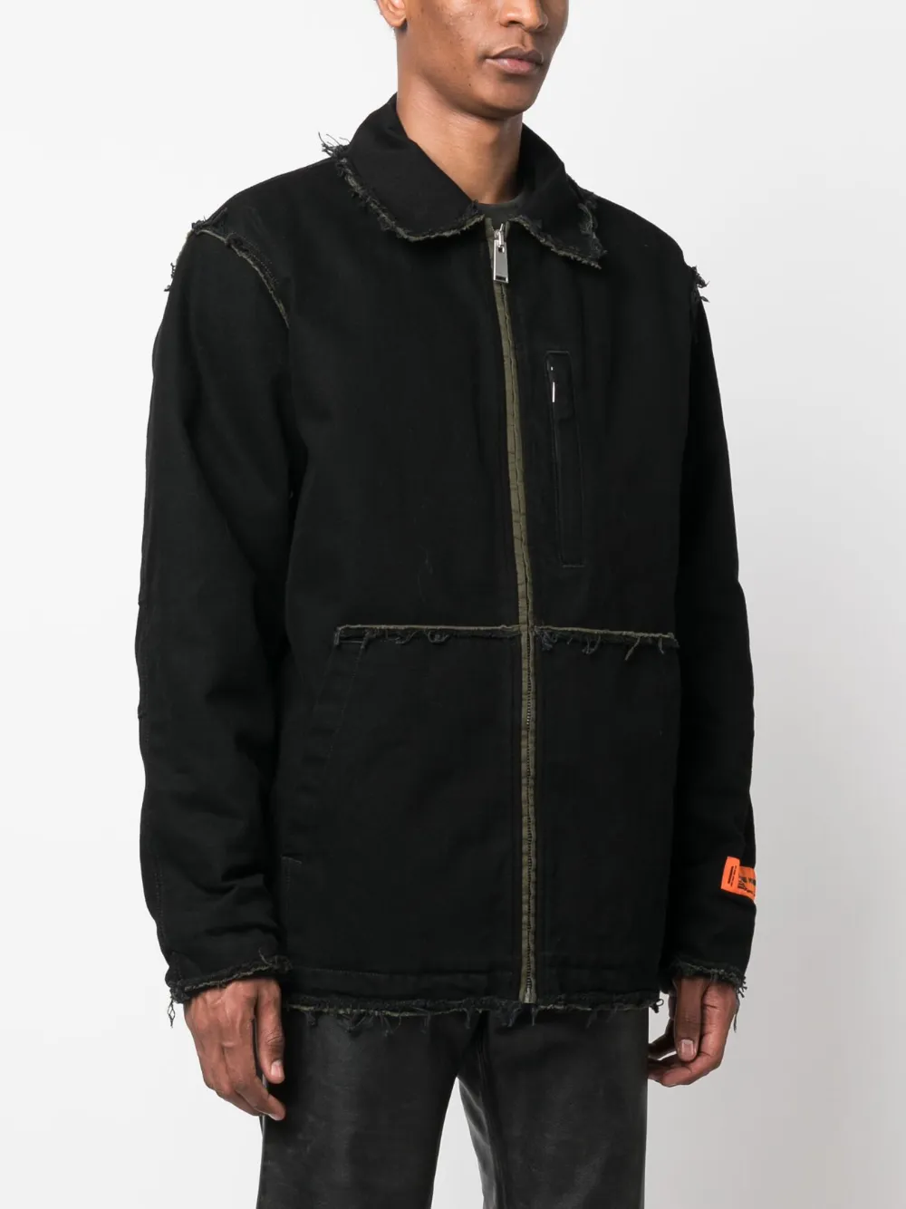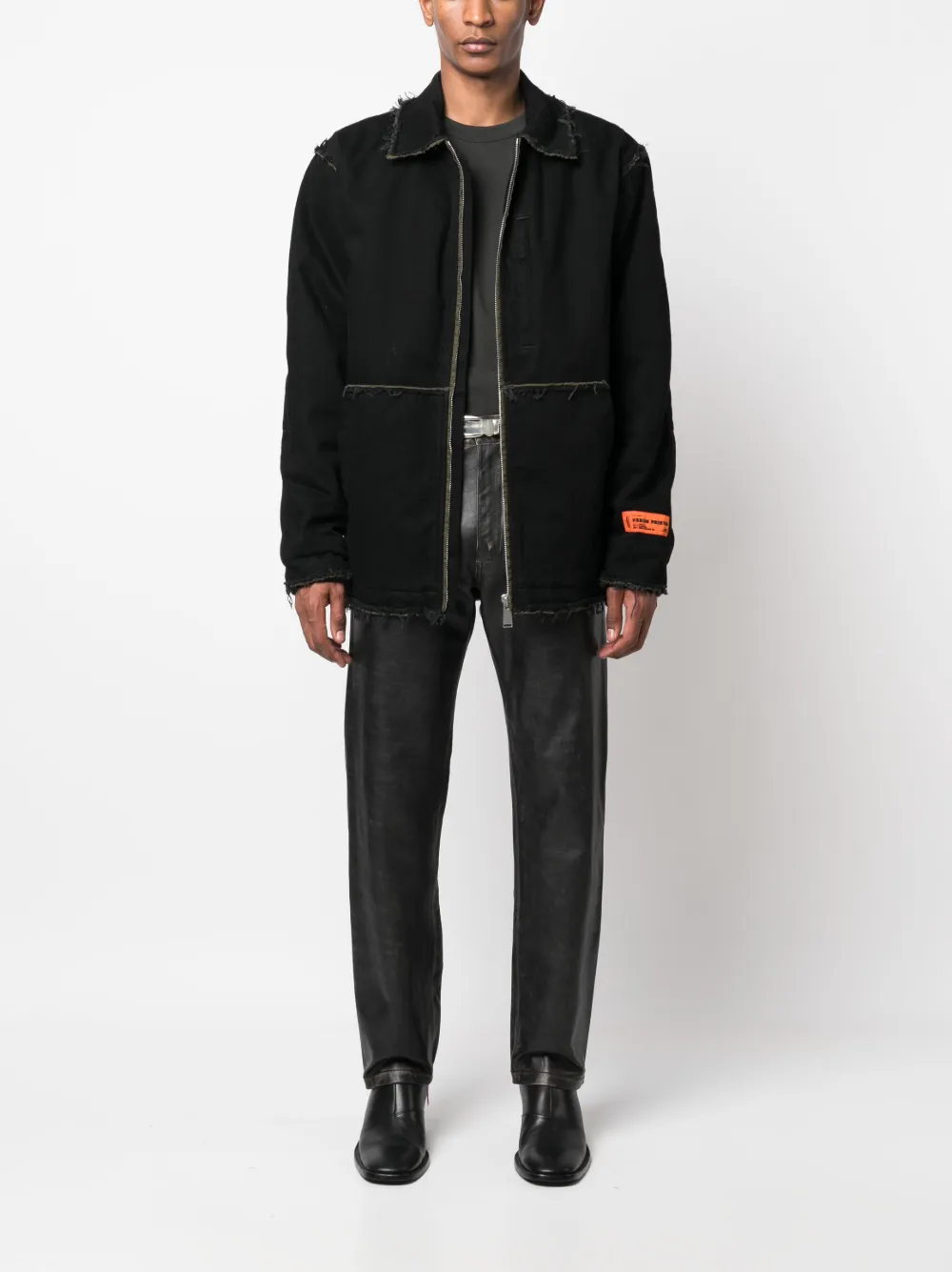 Черный, хлопок, деним, необработанные края, нашивка с логотипом на рукаве, классический воротник, застежка на молнии спереди, длинные рукава и прямой подол.