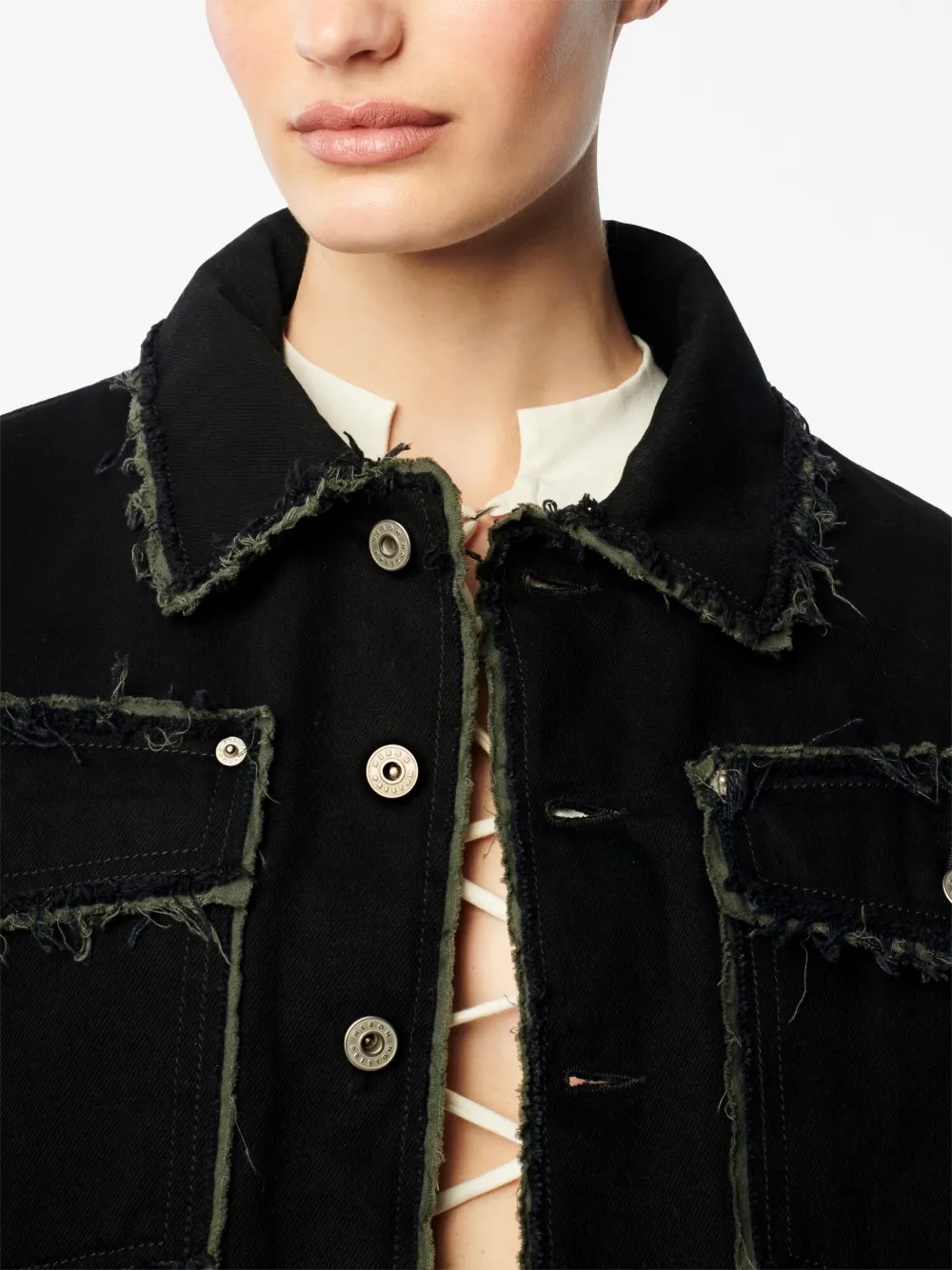 Черный, хлопок, искусственно состаренное покрытие, нашивка с логотипом на рукаве, классический воротник, застежка на пуговицах спереди, длинные рукава, манжеты на пуговицах, два нагрудных кармана с клапанами и укороченная длина.