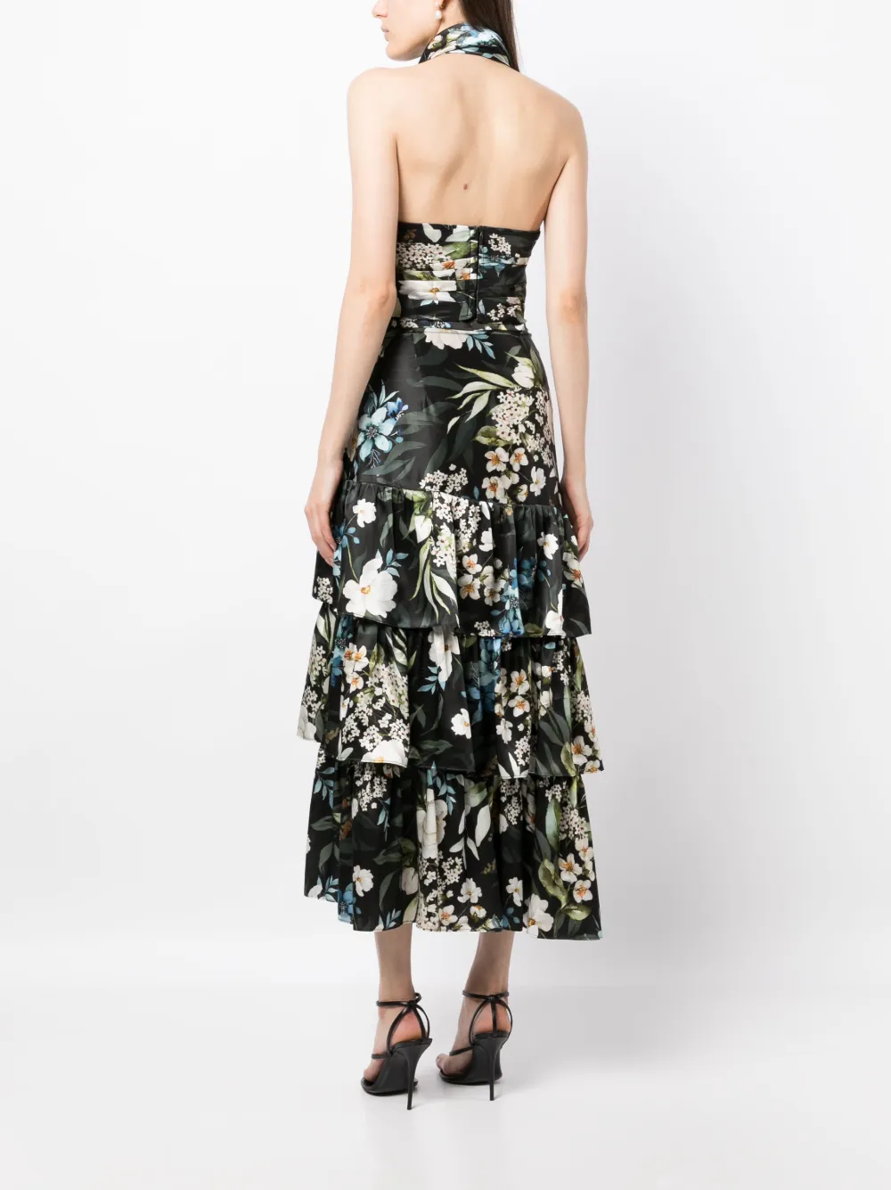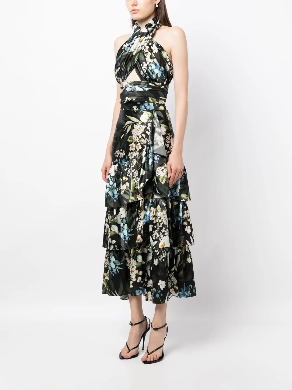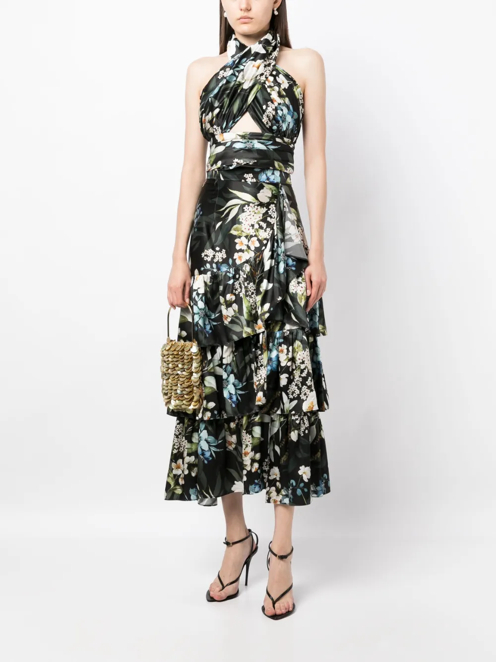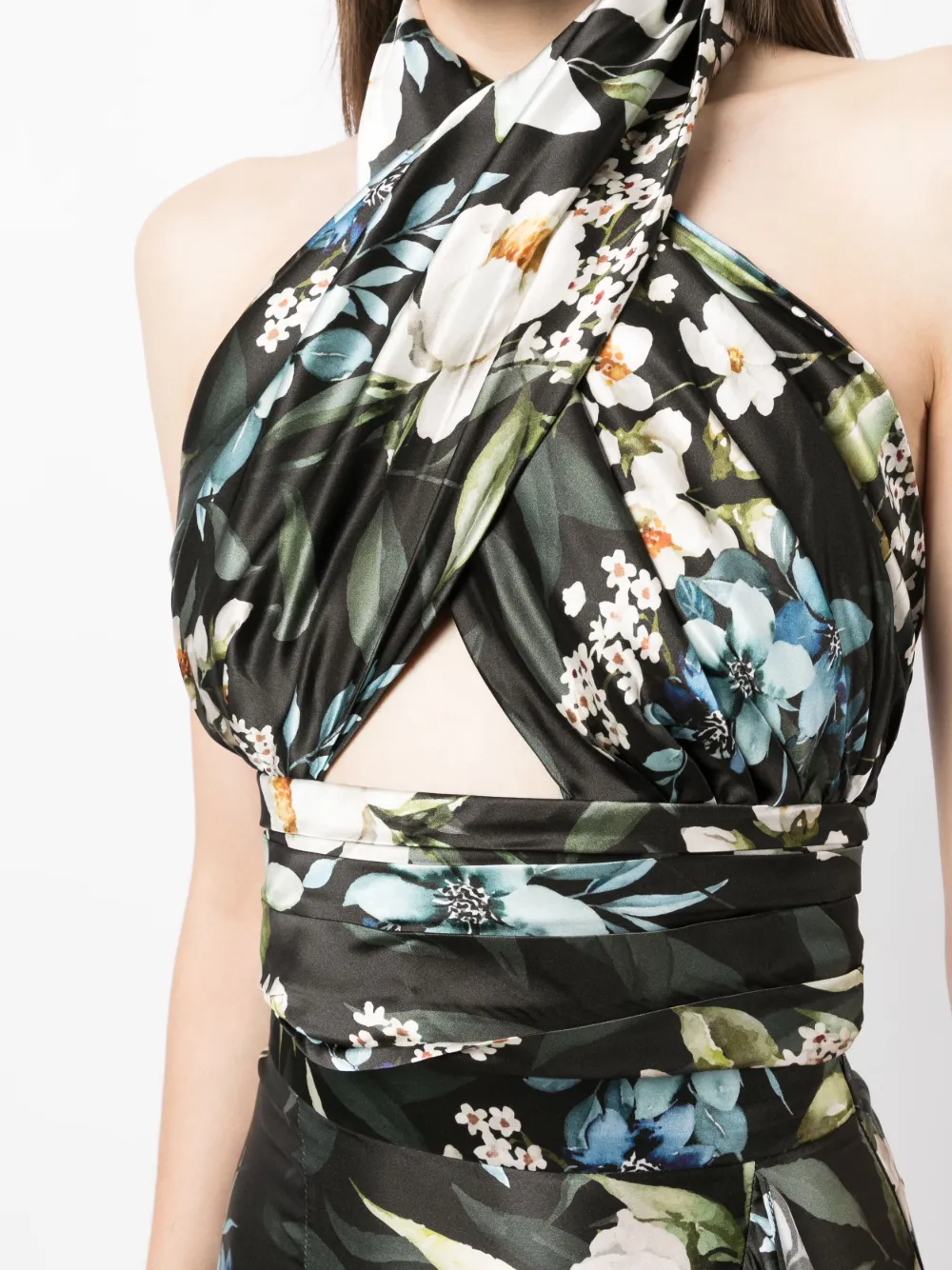 Черный/разноцветный, шелк, органза, сплошной цветочный принт, вырезные детали, укороченная длина, вырез-петля халтер и открытая спина.