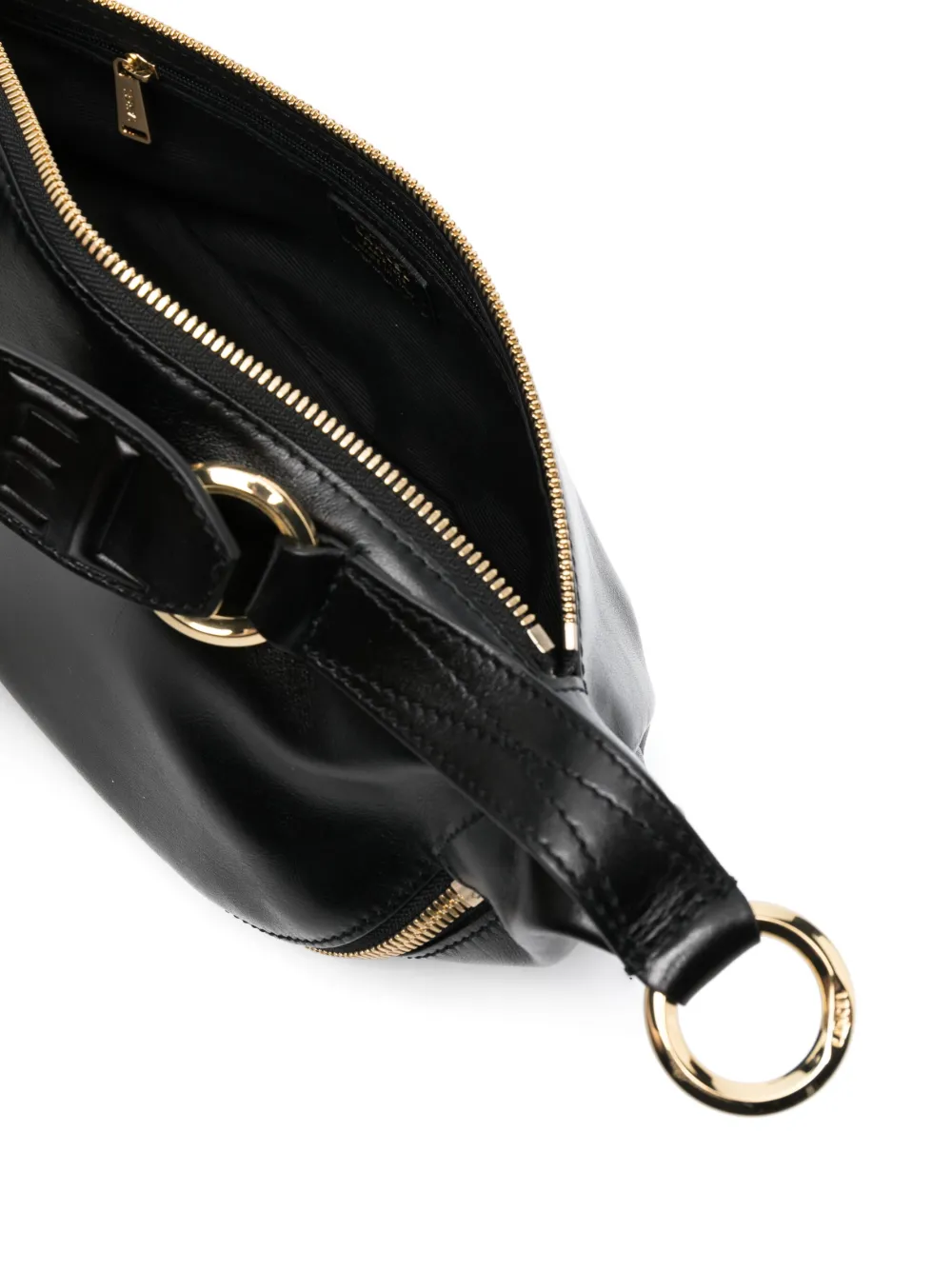 Черный, кожа, тисненый логотип спереди, застежка с тисненым логотипом, верхняя ручка, съемный регулируемый ремень на плечо, карман на молнии сзади, застежка на молнии сверху и внутренний карман на молнии.