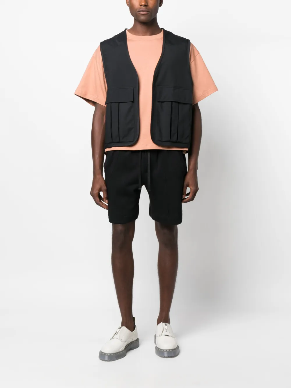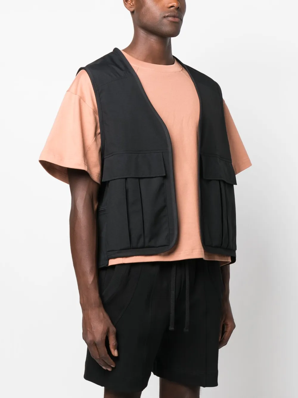Черный, модель без застежки, без рукавов, два передних кармана с клапанами, нашивка с логотипом сзади и прямой подол. Узнать больше о том, какие товары получают отметку «Ответственный выбор», можно из материала «Как мы оцениваем экологичность и этичность».