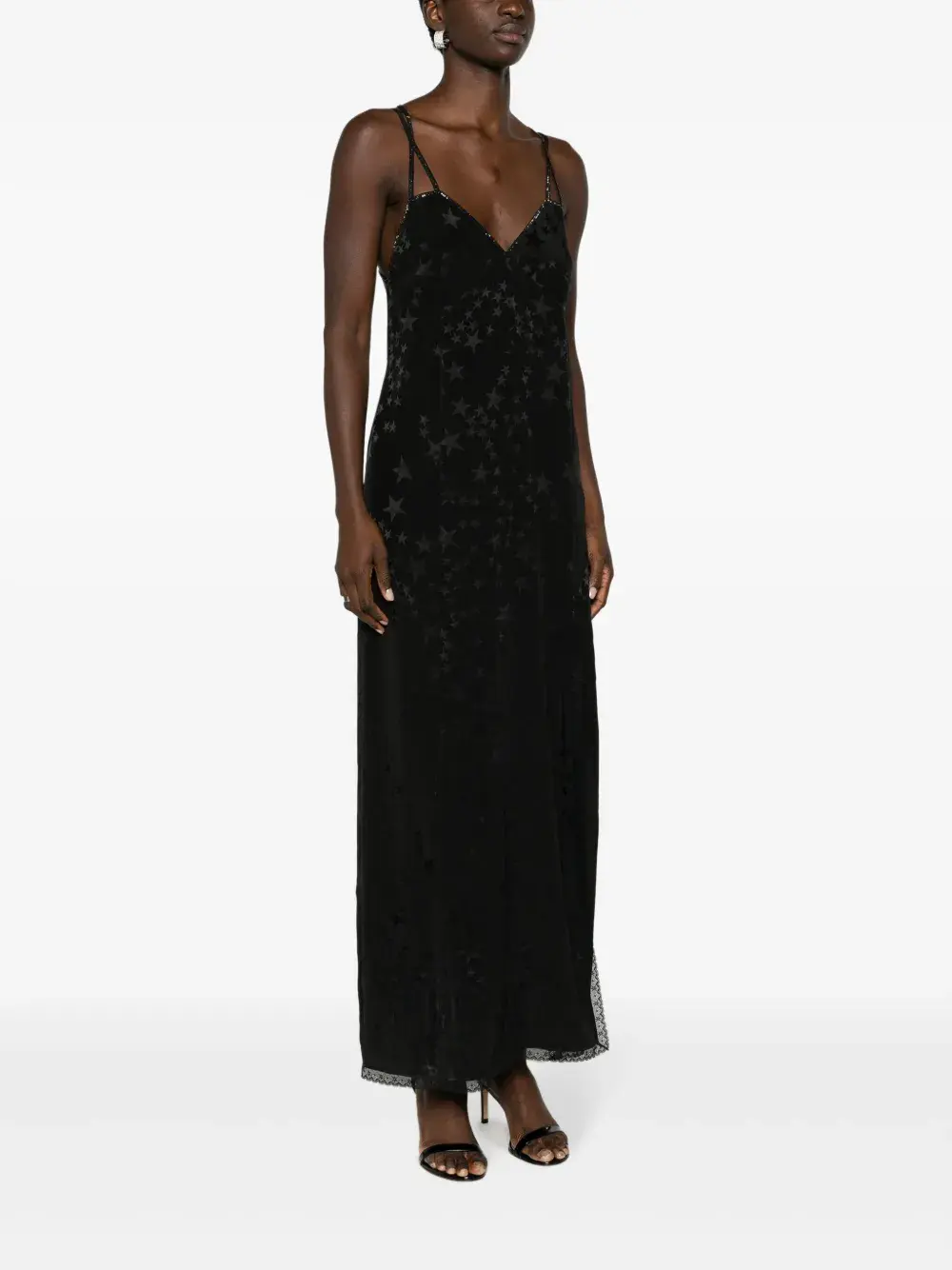 Черный, шелк, креповая текстура, жаккардовый материал с узором, декор из кристаллов, вставки из кружева, V-образный вырез, перекрестные ремешки, эластичный пояс сзади, боковой разрез и длина до середины голени.