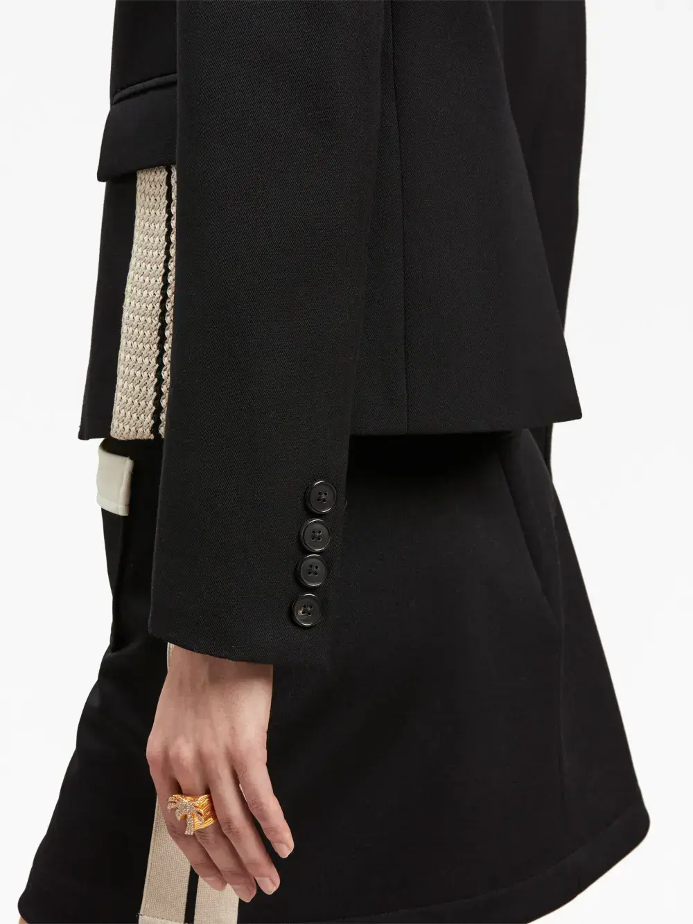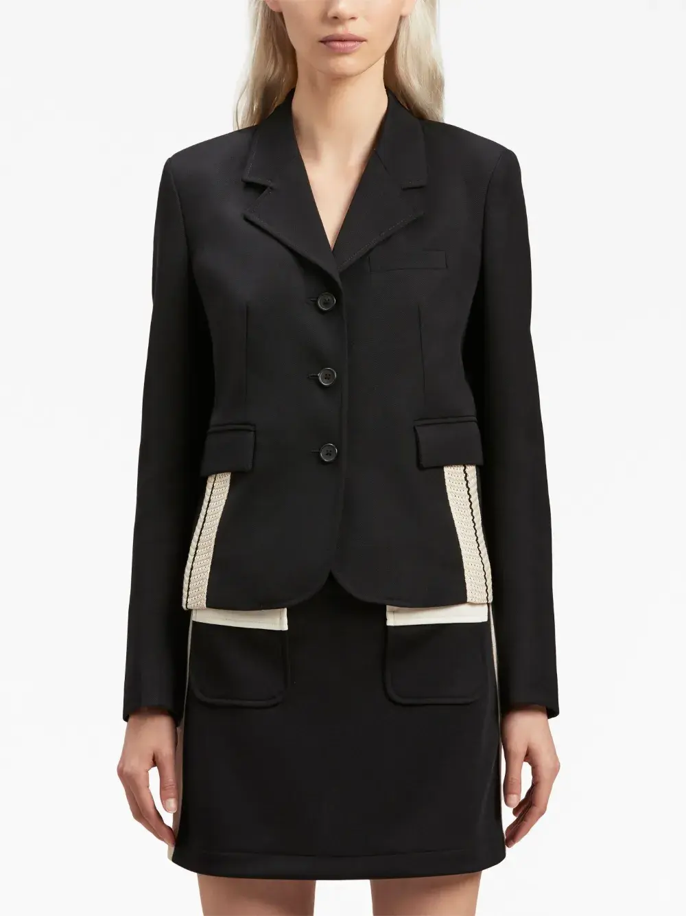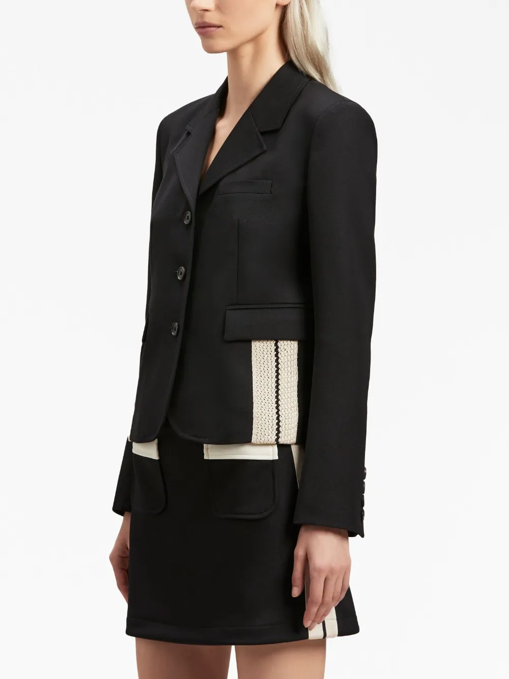 Черный, светло-бежевый, смесовая необработанная шерсть, полоски, зазубренные лацканы, застежка на пуговицах спереди, длинные рукава, манжеты на пуговицах, прорезной карман на груди, два передних кармана с клапанами и прямой подол.