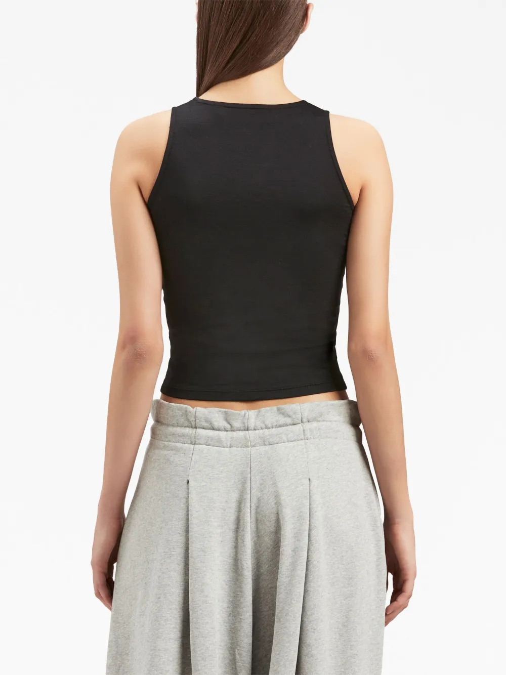 Черный, эластичный хлопок, детали с оборками, маленькая подвеска с логотипом, круглый вырез, без рукавов и прямой подол.