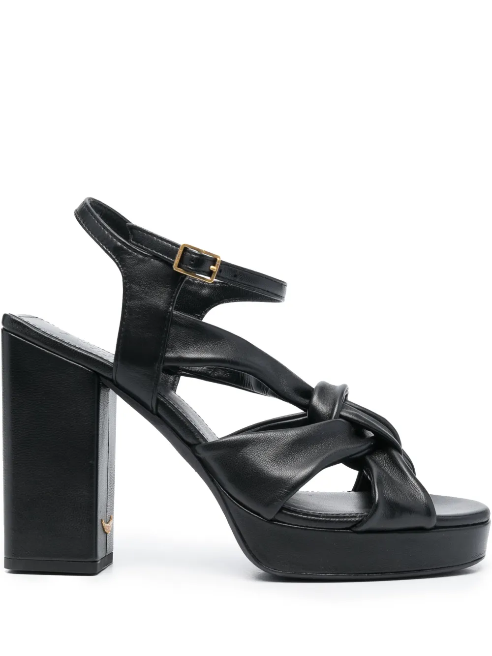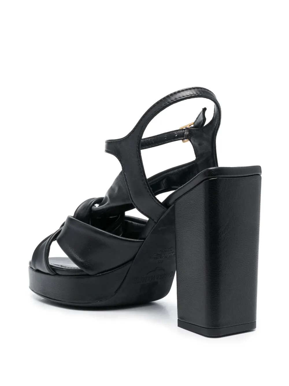 Черный, телячья кожа, декор в виде узла, несколько вариантов крепления бретелей, ремешок на щиколотке с пряжкой, квадратный открытый носок, высокий блочный каблук и стелька с логотипом.