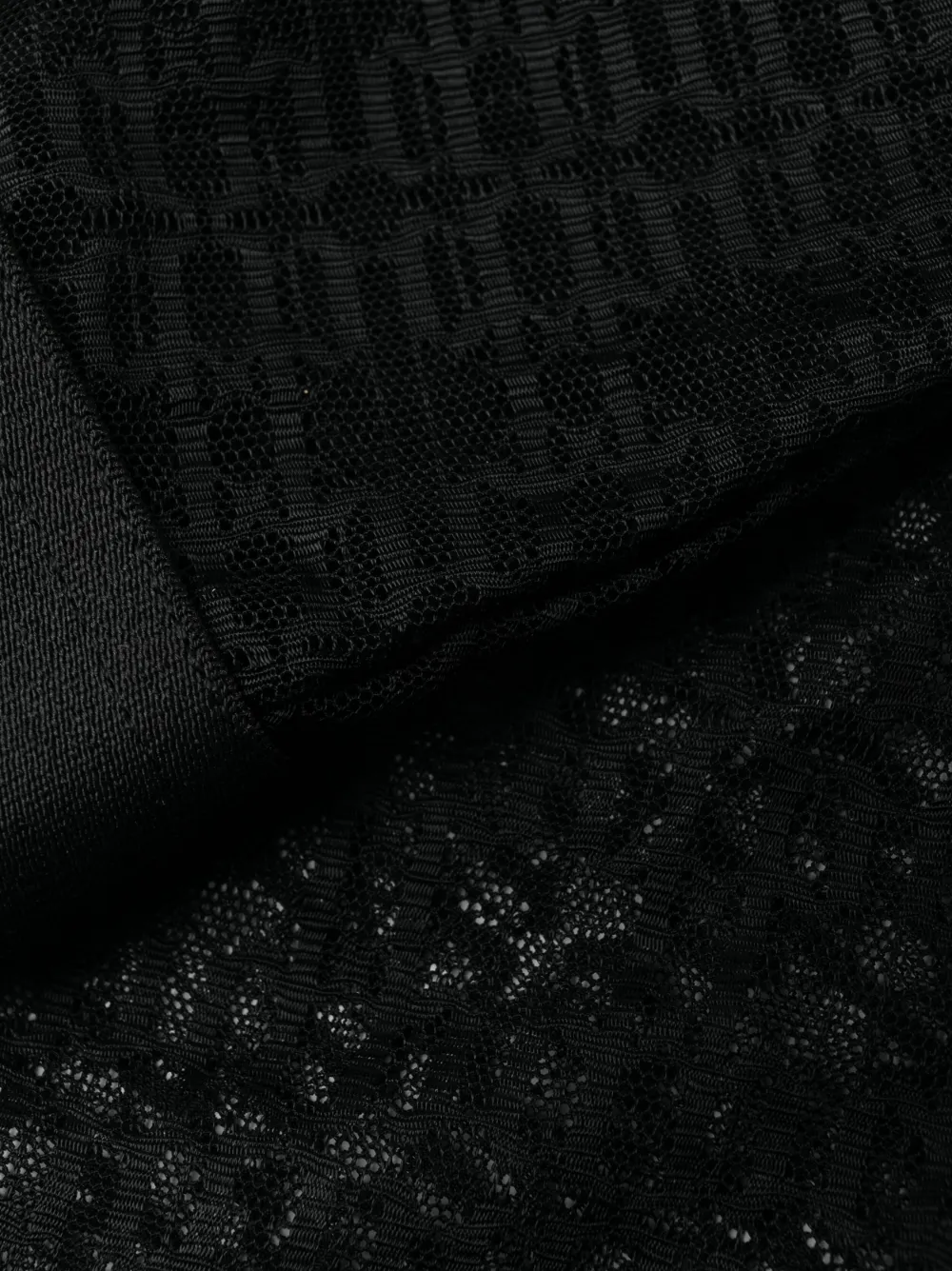 Черный, эластичный материал, кружевные вставки, пояс с логотипом и завышенная талия. Эту вещь можно примерить, но только поверх собственного белья.