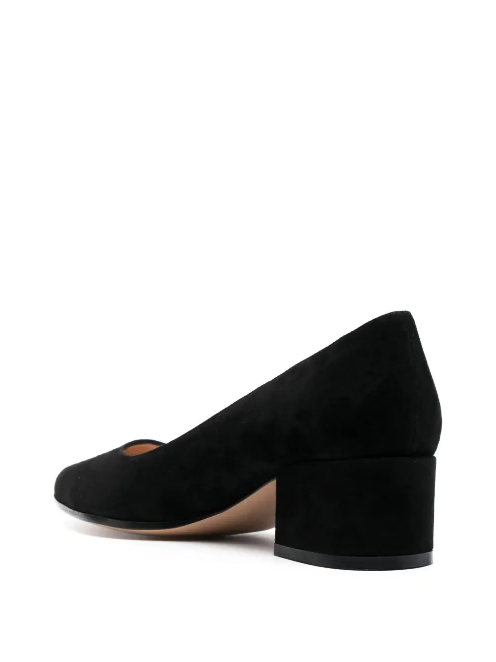 Черный, замша из телячьей кожи, телячья кожа, кожаная стелька с логотипом, заостренный носок и блочный каблук.