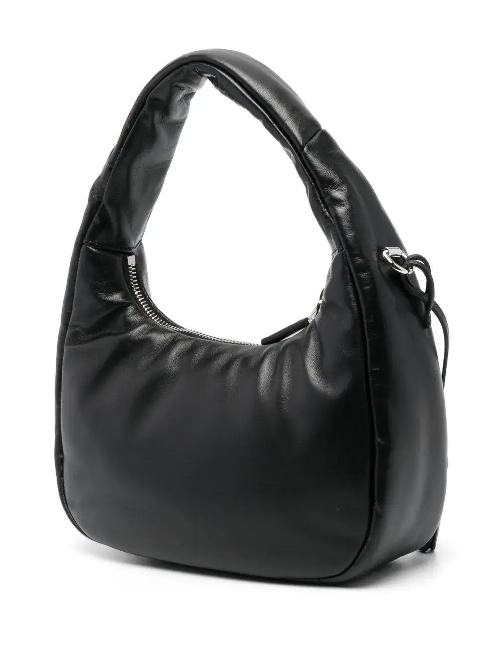 Черный, телячья кожа, металлический логотип, багажный ярлык, застежка на молнии сверху и съемный регулируемый ремень на плечо.