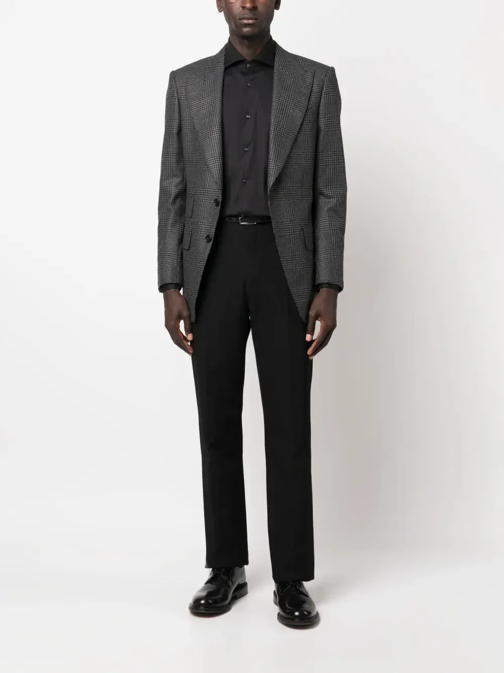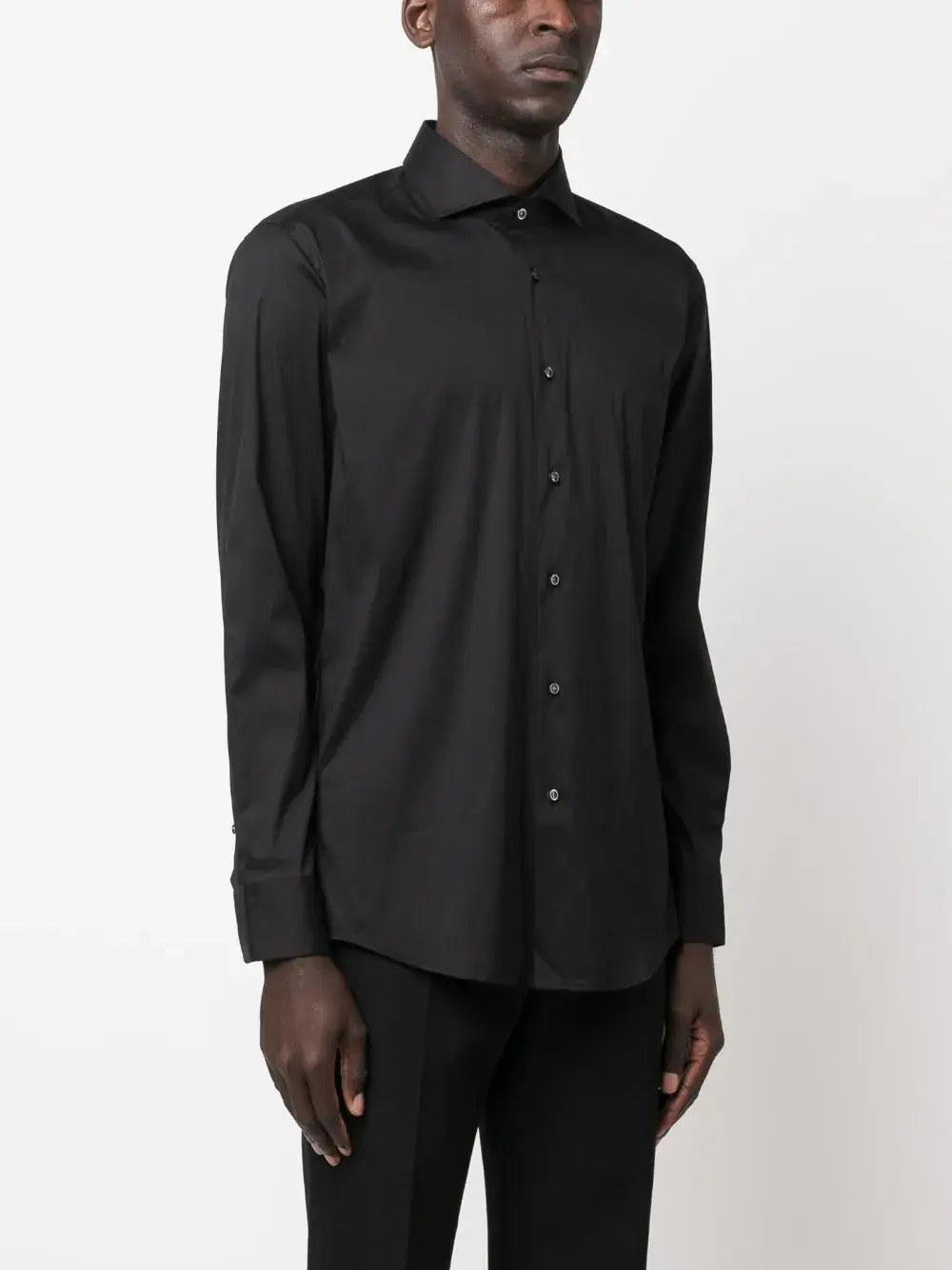 Черный, смесовый хлопок, отложной воротник, застежка на пуговицах спереди, длинные рукава, манжеты на пуговицах и закругленный подол.