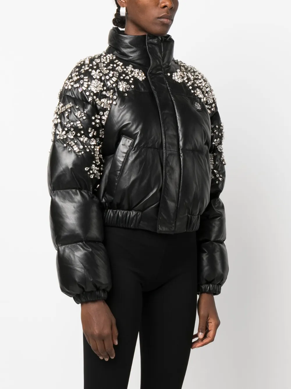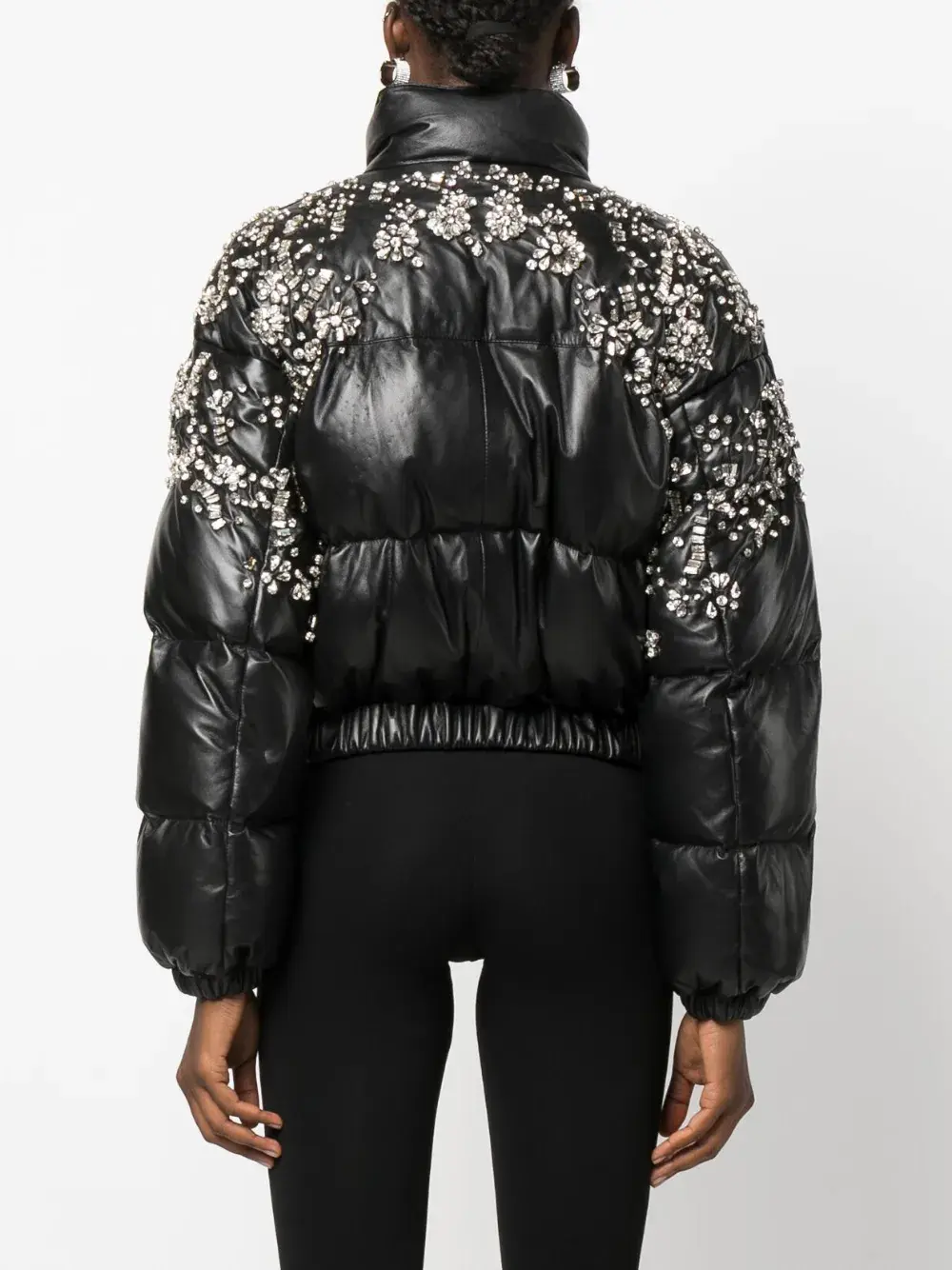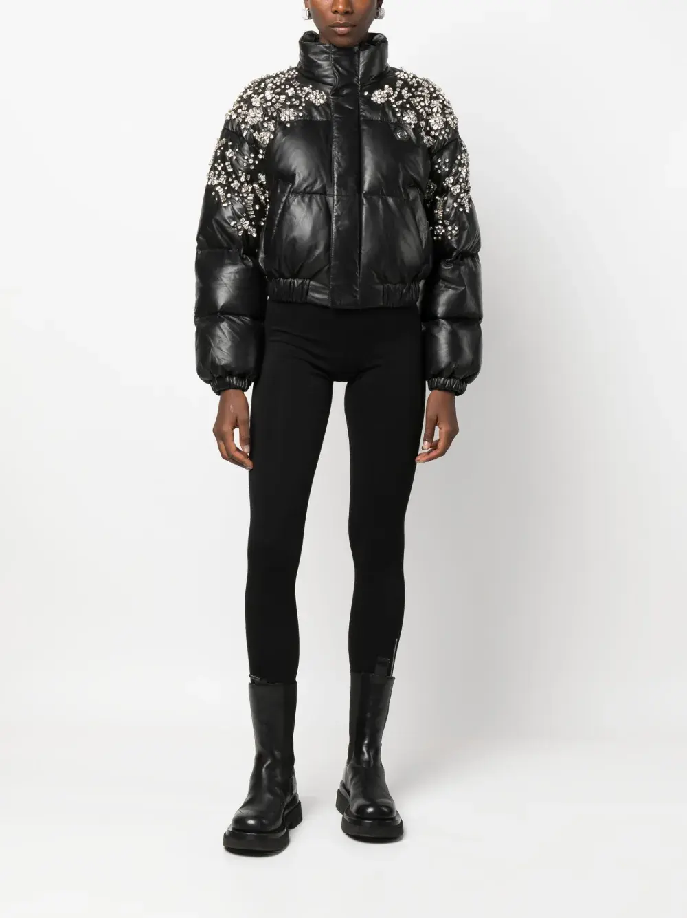 Черный, овечья кожа, зернистая текстура, дутый материал, декор из кристаллов, логотип в тон, высокий воротник, потайная застежка спереди, два передних кармана с листочкой, эластичный пояс, длинные широкие рукава, эластичные манжеты и прямой подол.