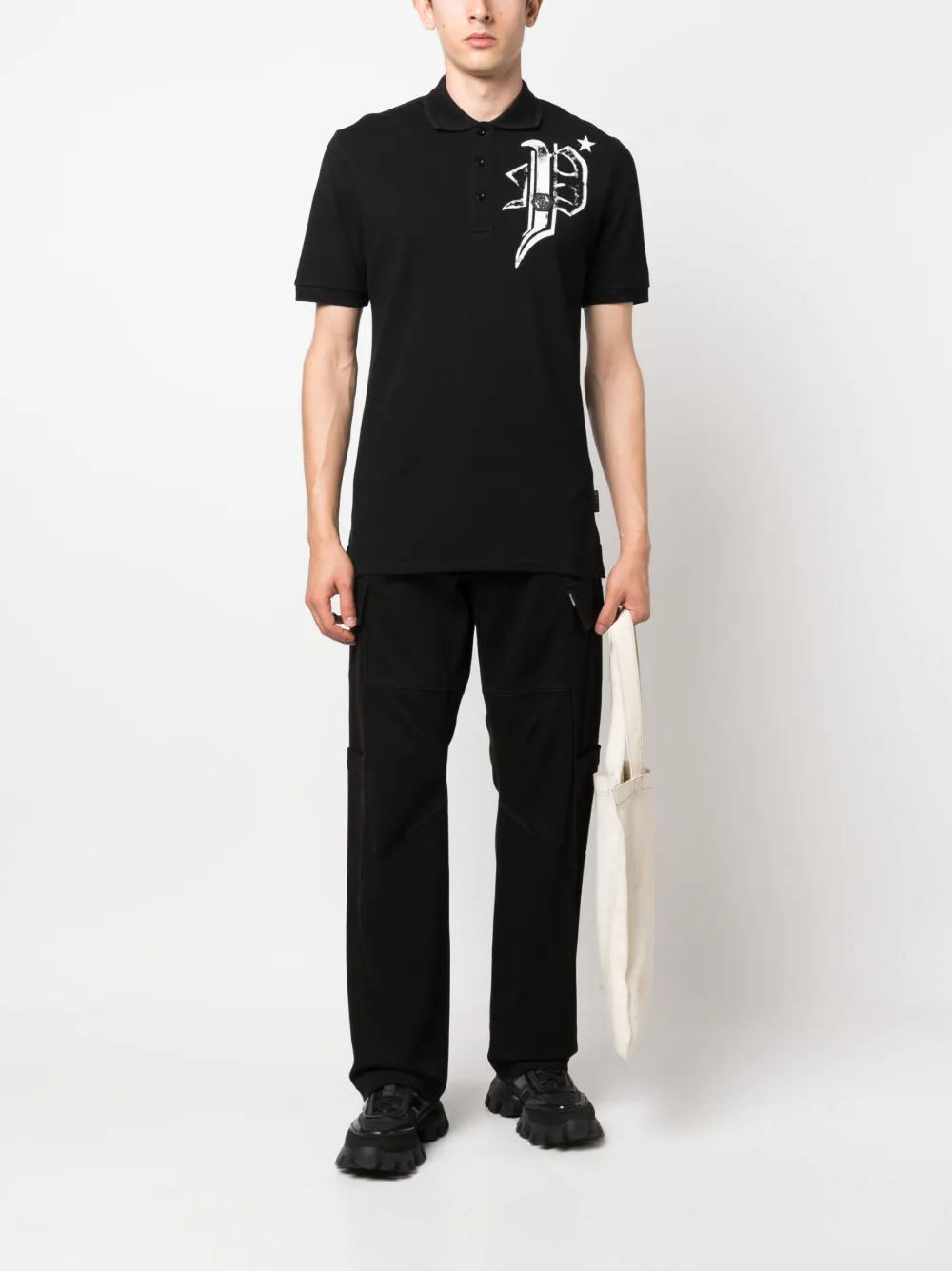 Черный/белый, смесовый хлопок, принт с изображением черепа на тыльной стороне, принт с логотипом на груди, воротник поло, планка на пуговицах спереди, короткие рукава и прямой подол.