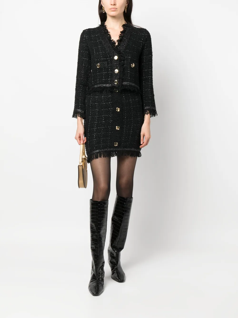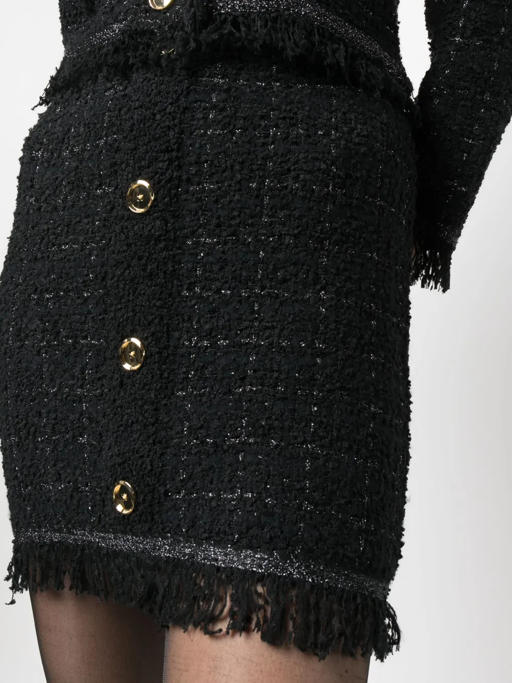 Черный, плетеный материал, вставки из люрекса, застежка на пуговицах спереди, завышенная талия, края с бахромой и длина до бедер.