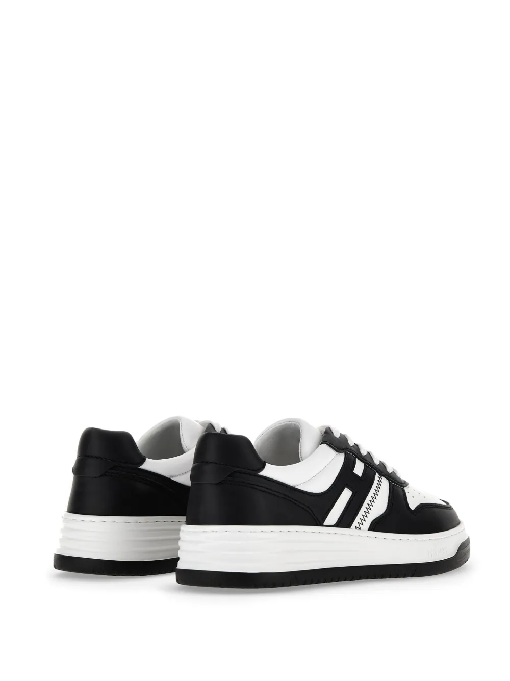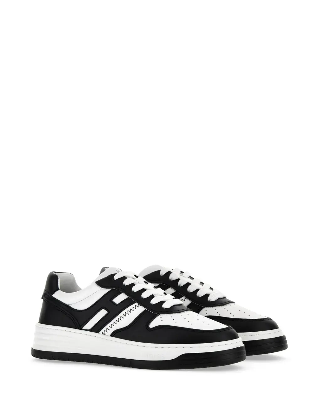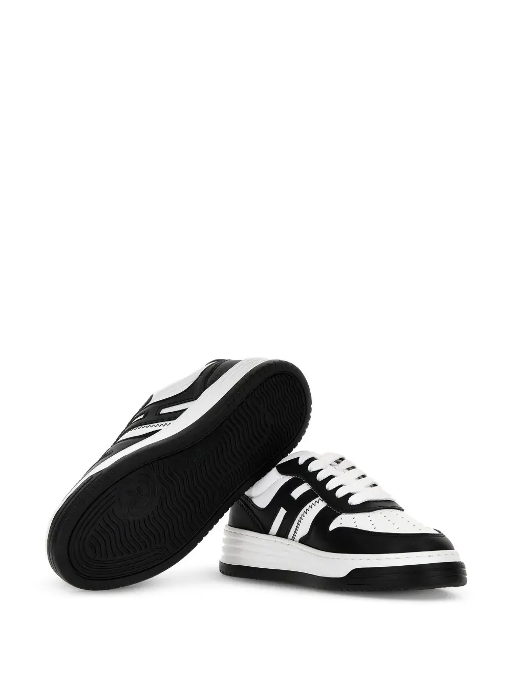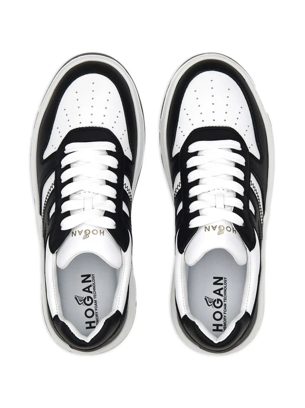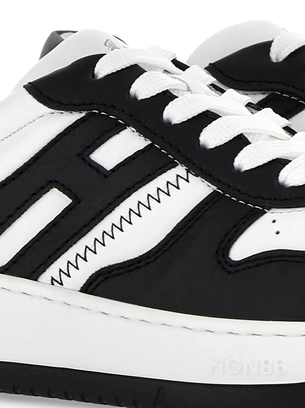 Белый, черный, кожа наппа, гладкая текстура кожи, дизайн колор-блок, перфорированный носок, язычок с логотипом, стелька с логотипом, закругленный носок, шнуровка спереди и плоская резиновая подошва.