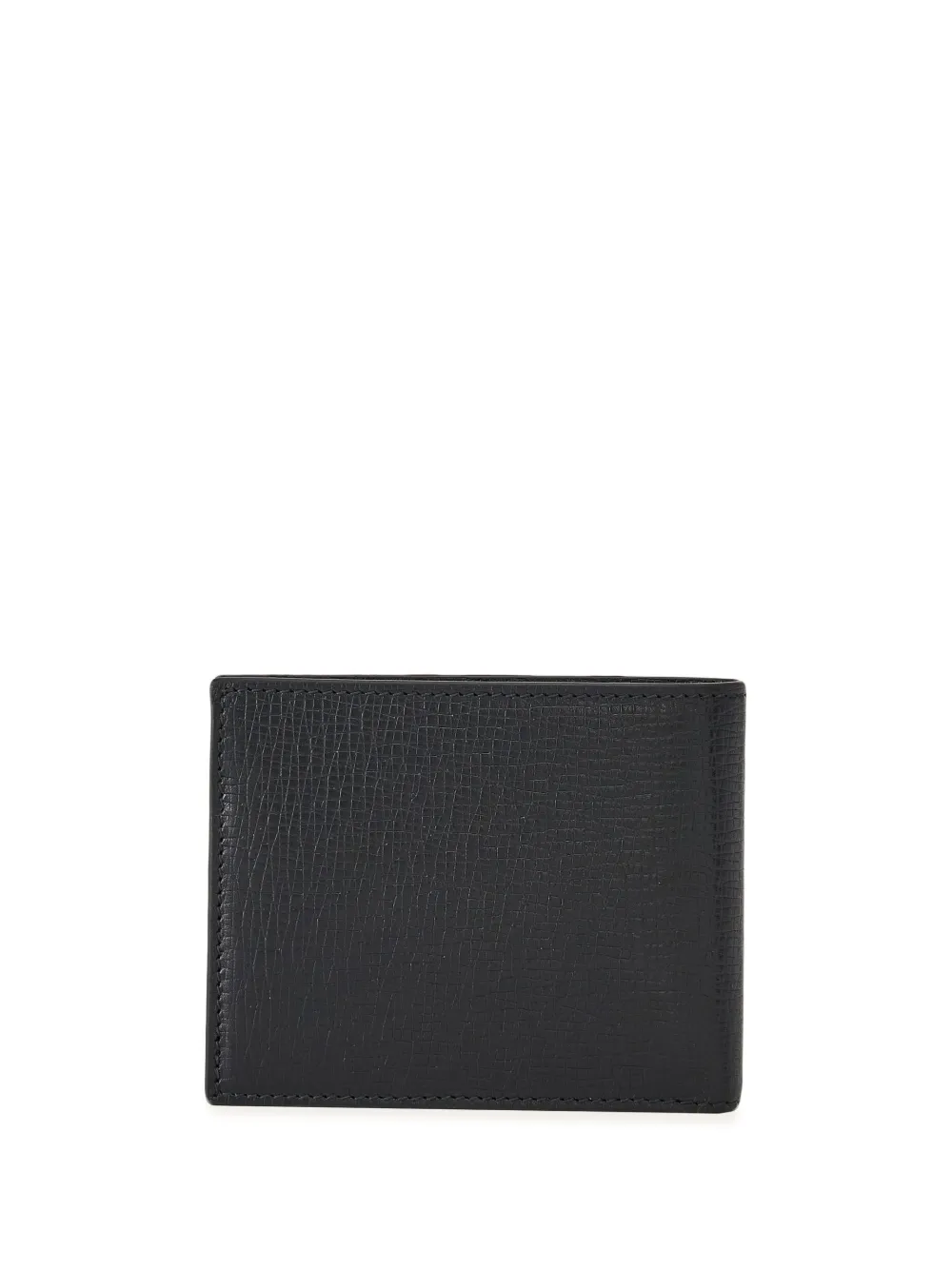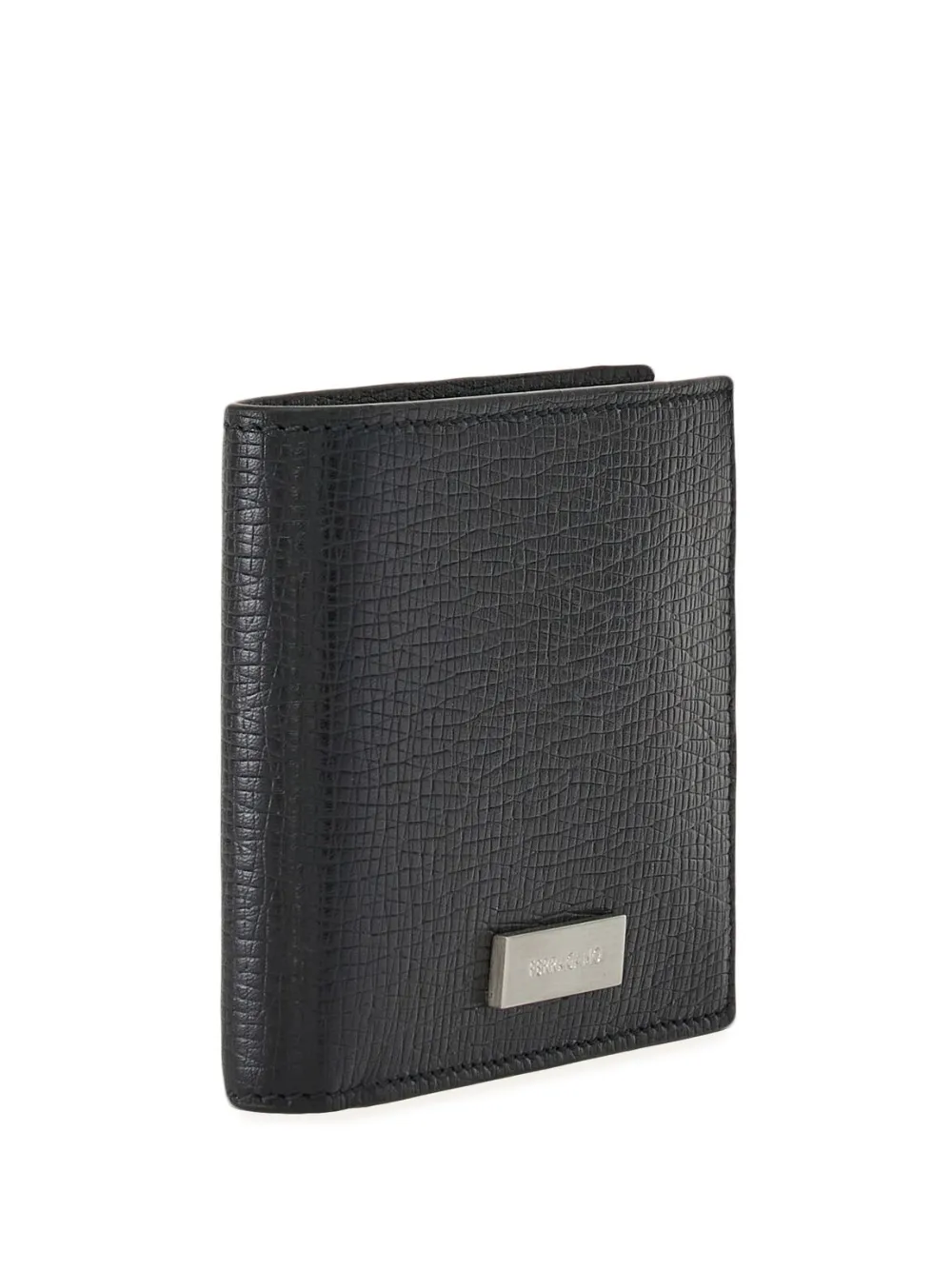 Черный, телячья кожа, зернистая текстура, серебристый металлический логотип, декоративные складки, тисненый логотип внутри, внутренние отделения для карт и внутренние накладные карманы.