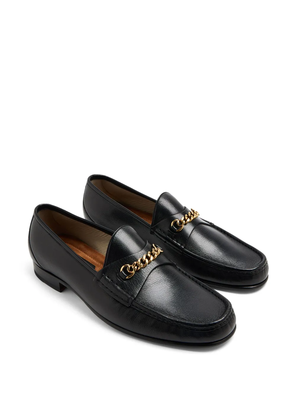 Черный, кожа, цепочка, золотистая фурнитура, закругленный носок, полукруговой шов на носке, низкий каблук и модель без застежки.