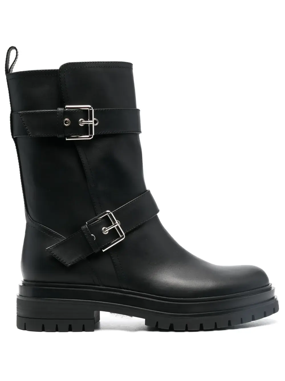 Черный, телячья кожа, закругленный носок, боковые застежки с пряжками, стелька с логотипом и плоская подошва.