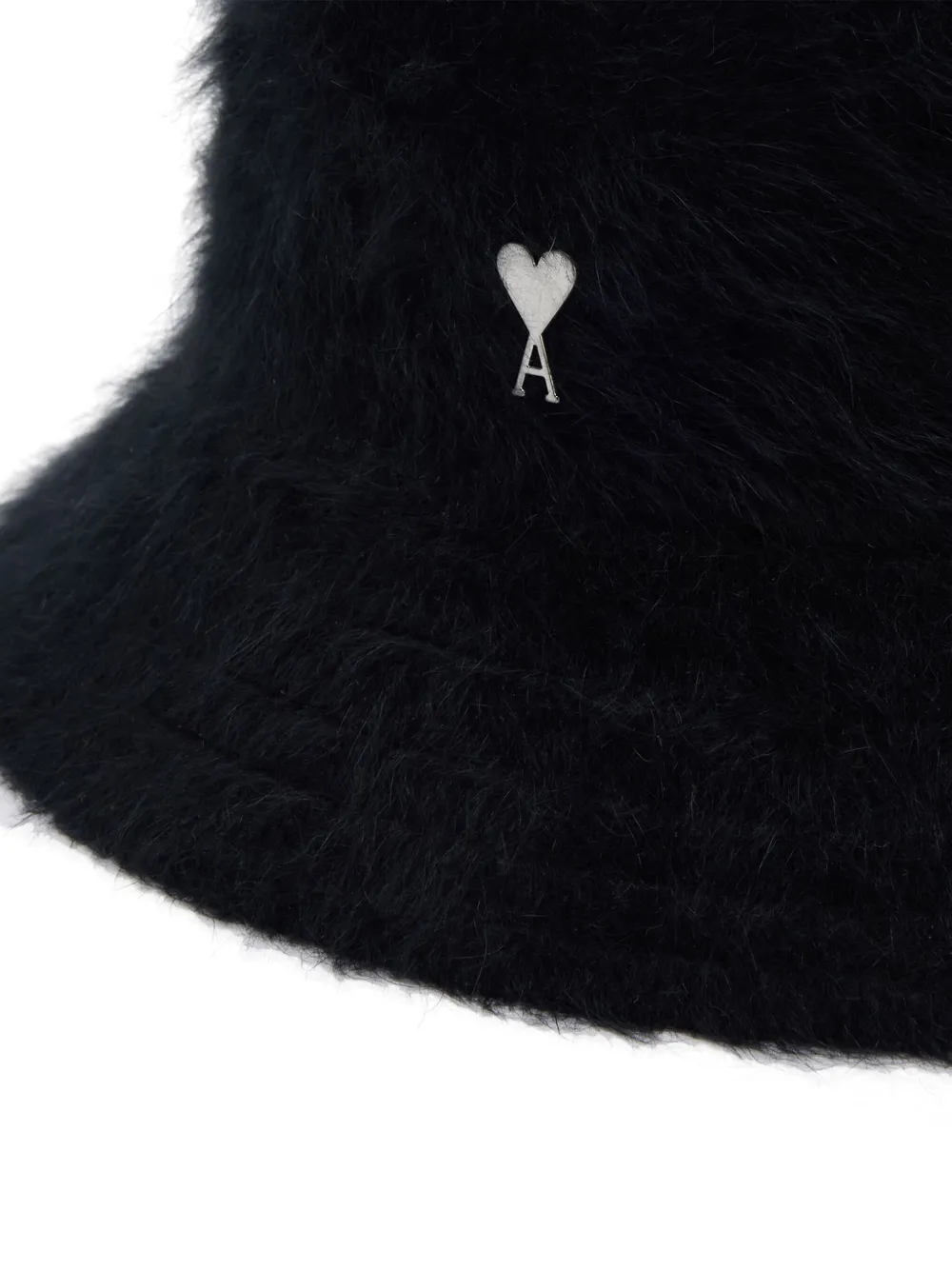 Черный, смесовая шерсть, фактурная отделка, знаковая монограмма Ami de Coeur, серебристый металлический логотип, плоская тулья, узкие опущенные поля и модель без застежки.