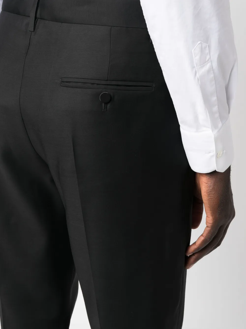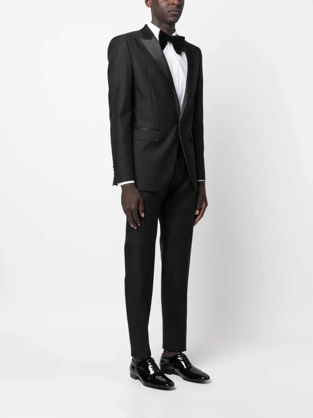 Черный, смесь шерсти и шелка, зазубренные лацканы, застежка на пуговицах спереди, две боковые шлицы сзади, рукава с манжетами на пуговицах, прорезной карман на груди, два передних кармана с клапанами, длинные рукава, петли для ремня, потайная застежка спереди, два прорезных кармана по бокам, стрелки, два кармана с листочкой сзади, узкий крой и прямой подол.