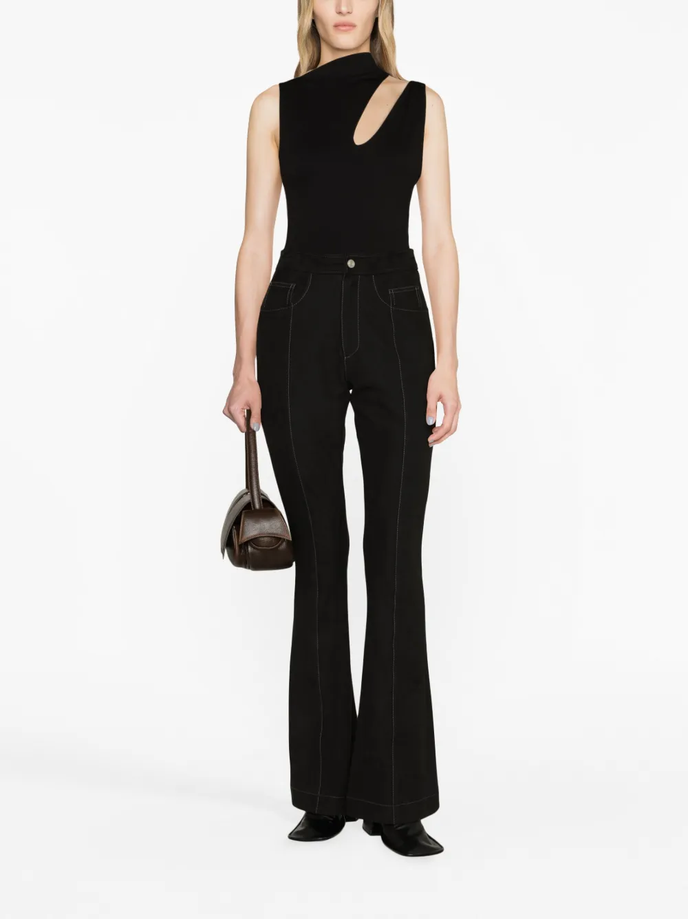 Черный, эластичный материал, вырезные детали, без рукавов и плавки бикини с завышенной талией.