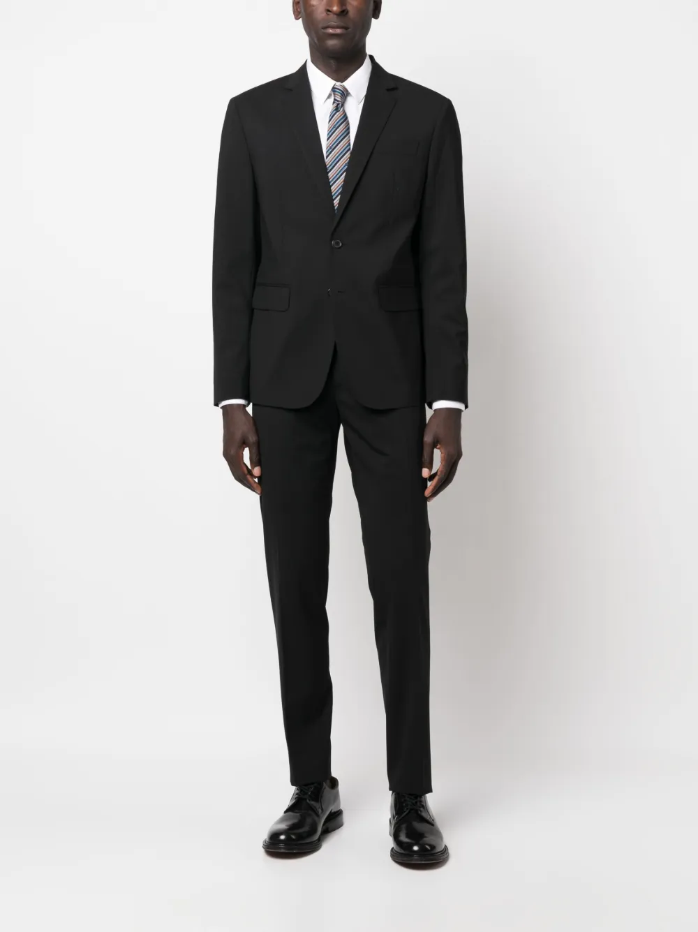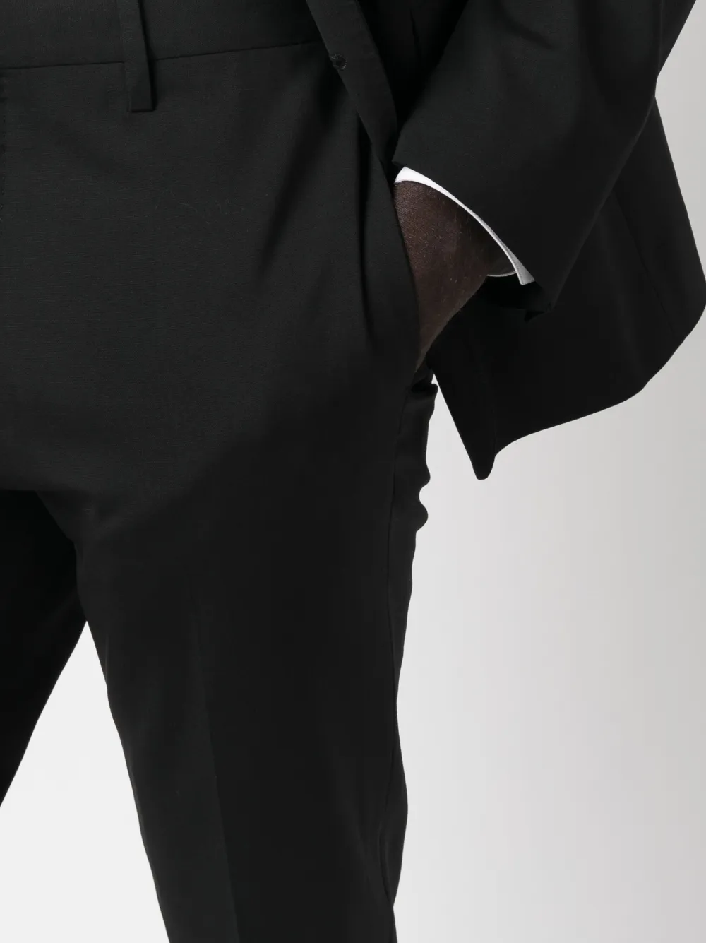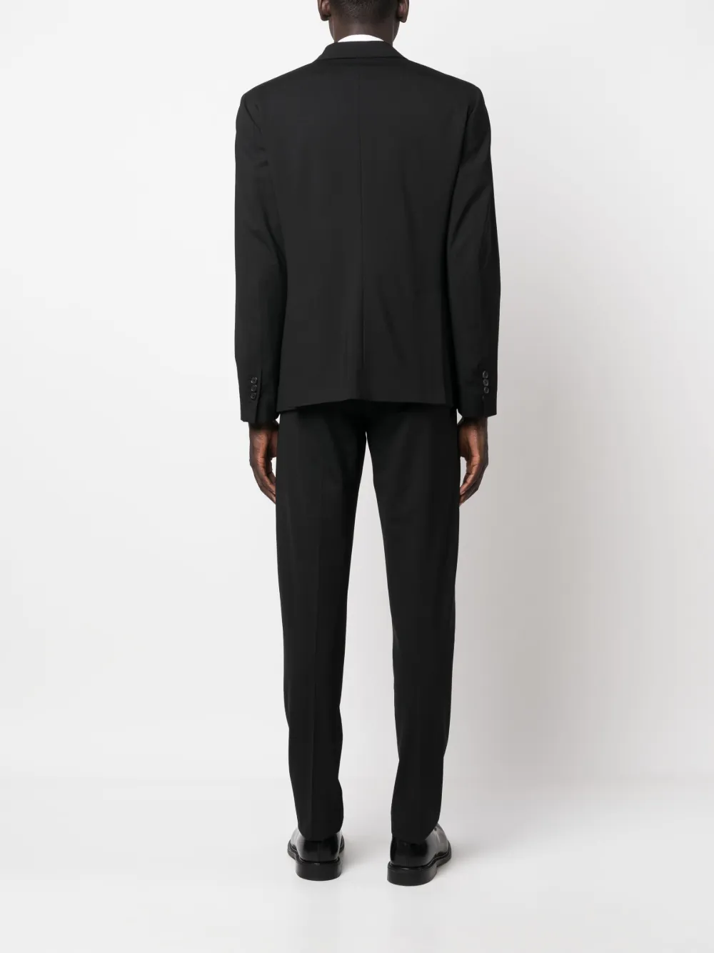 Черный, смесовая шерсть, зазубренные лацканы, застежка на пуговицах спереди, две боковые шлицы сзади, рукава с манжетами на пуговицах, прорезной карман на груди, два передних кармана с клапанами, длинные рукава, петли для ремня, потайная застежка спереди, два прорезных кармана по бокам, стрелки, два кармана с листочкой сзади, узкий крой и прямой подол.