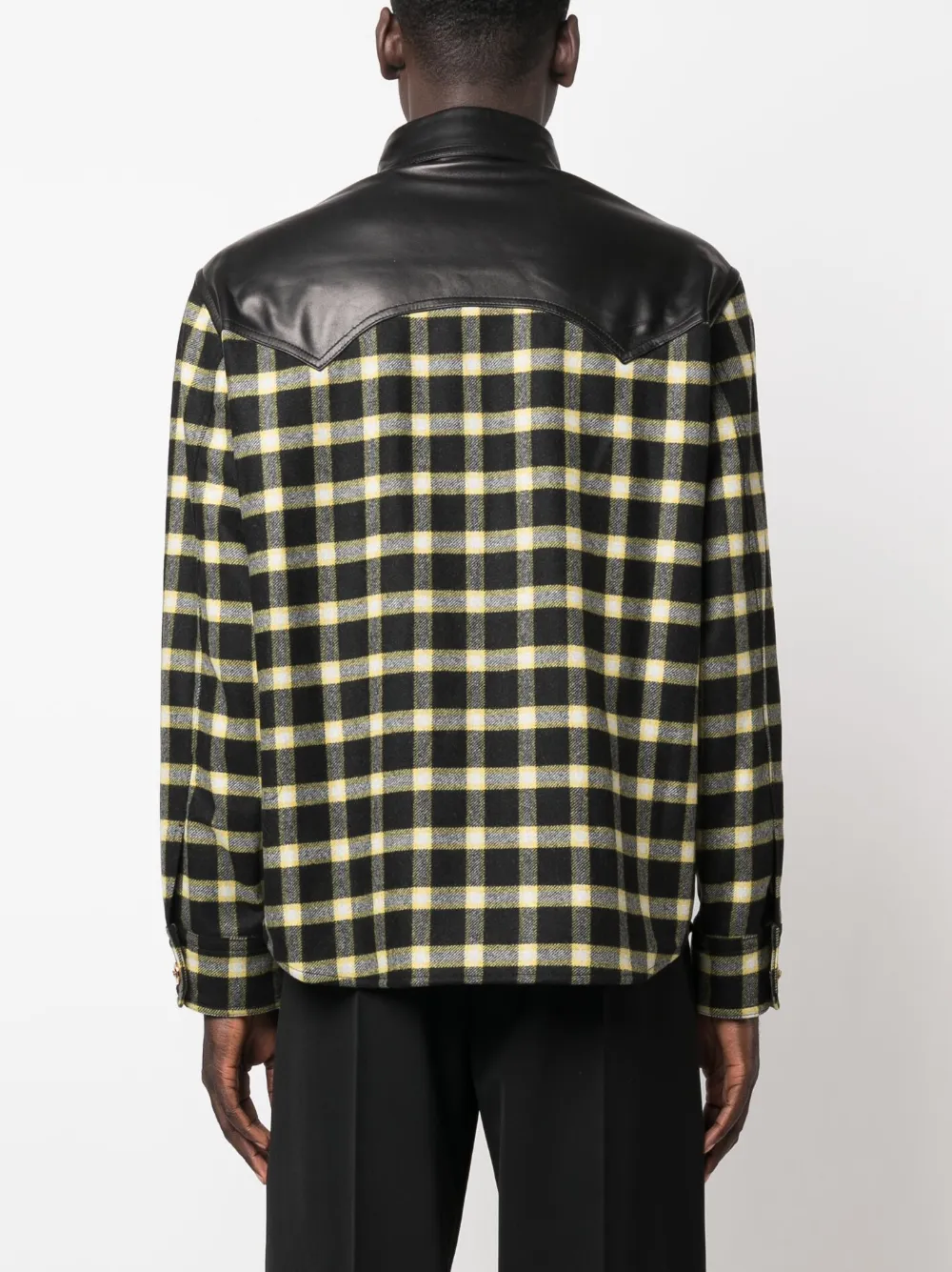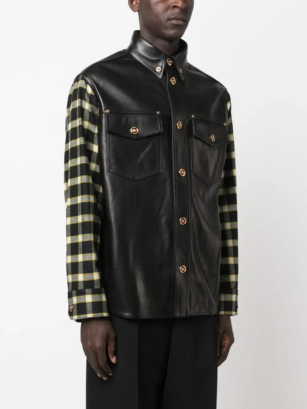 Черный, ярко-желтый, кремовый, телячья кожа, смесовая шерсть, клетчатый узор, воротник на пуговицах, застежка на пуговицах спереди, пуговицы с декором Medusa Head, длинные рукава, манжеты на пуговицах, два накладных кармана на груди и закругленный подол.