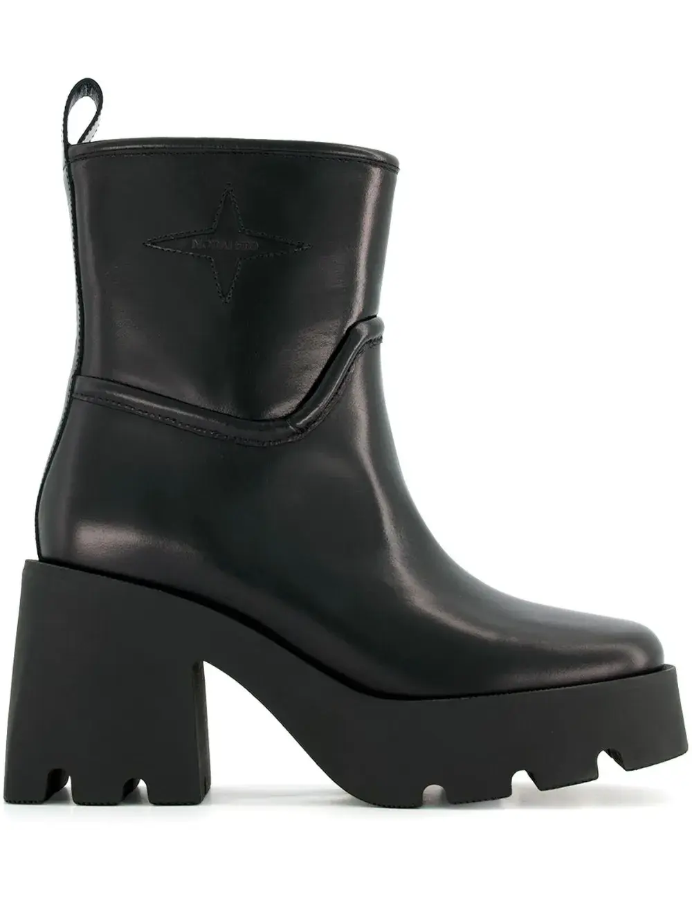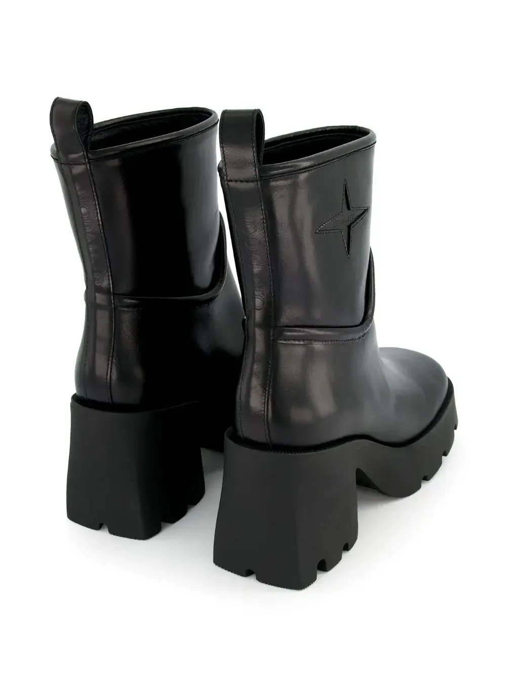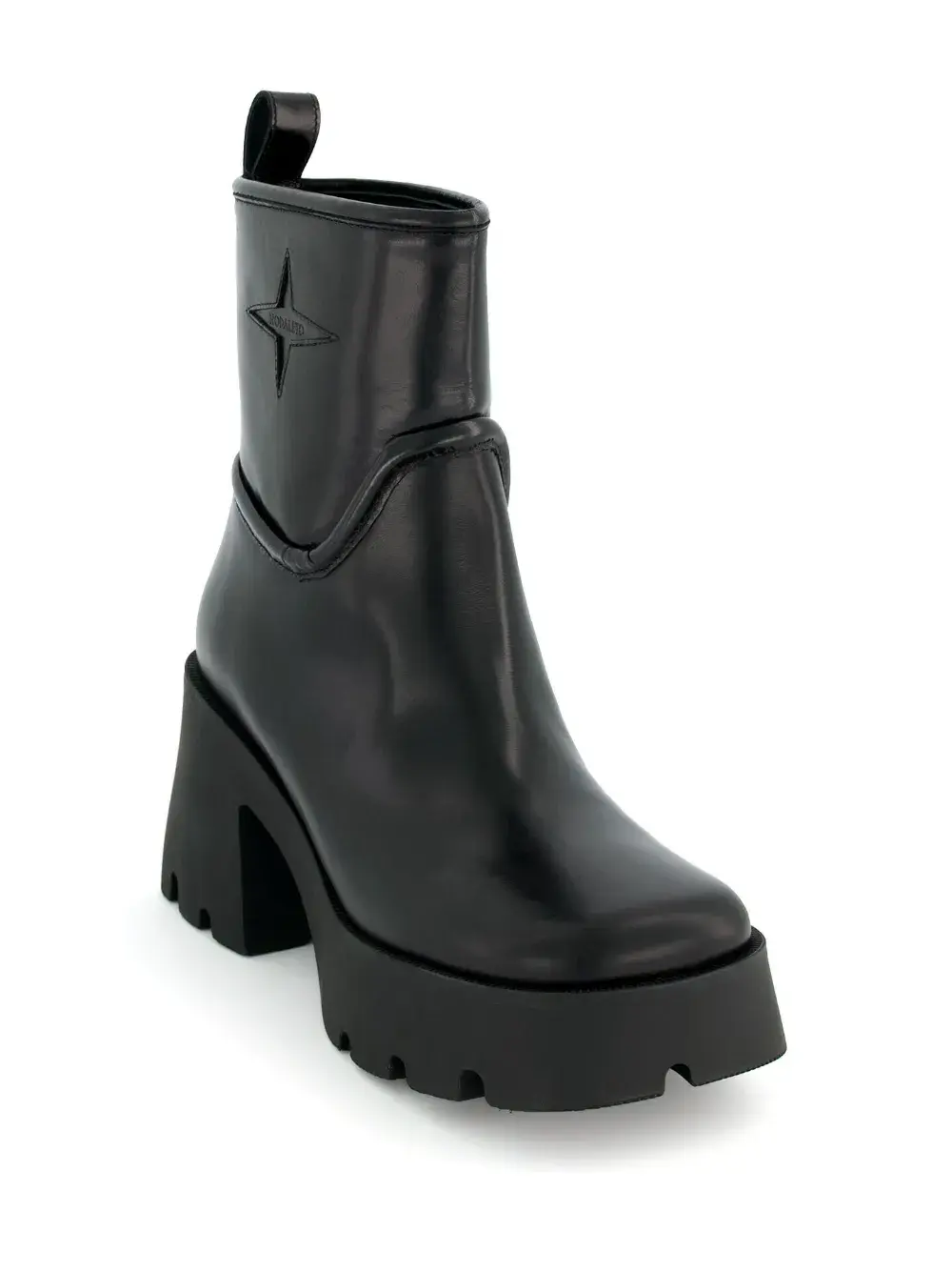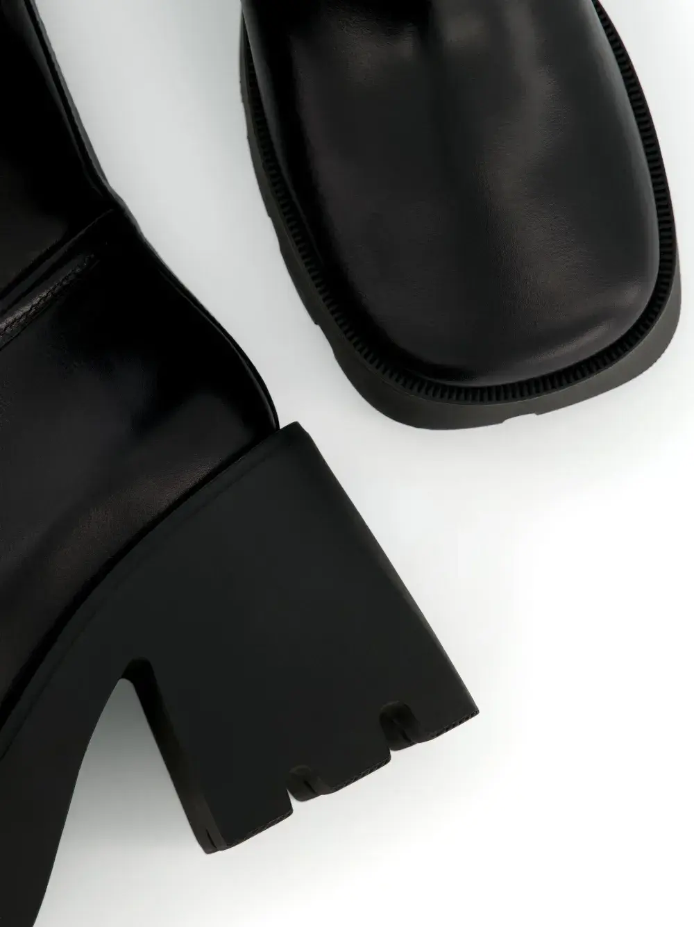 Черный, кожа, тисненый логотип сбоку, квадратный носок, модель без застежки, петля для подтягивания с логотипом, массивная резиновая подошва c протектором и блочный каблук.