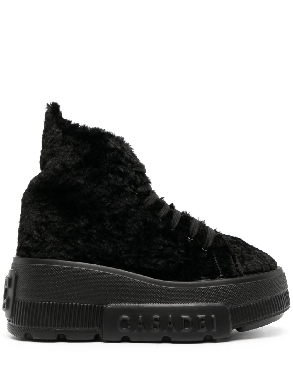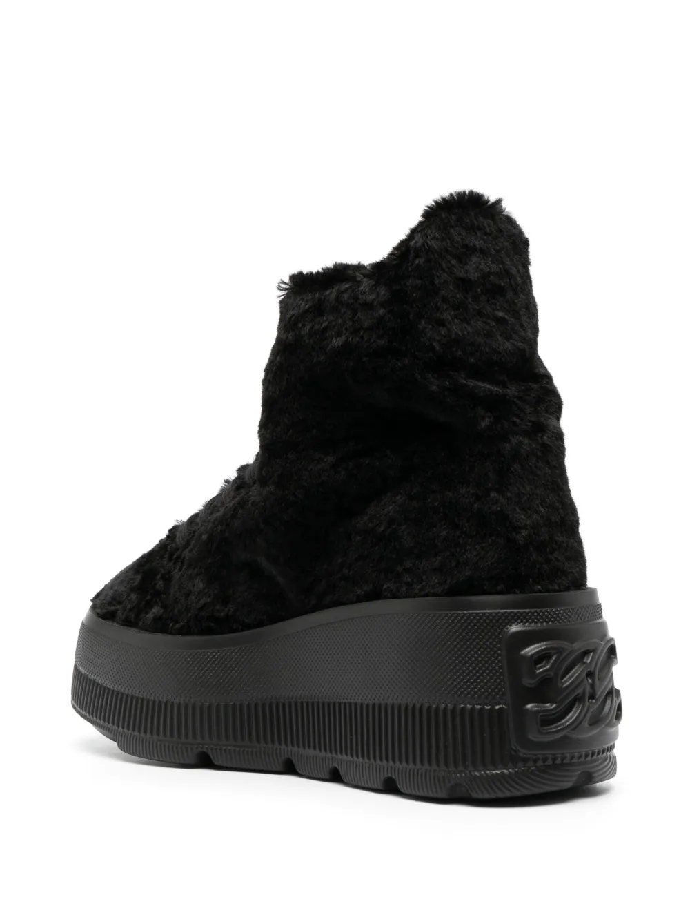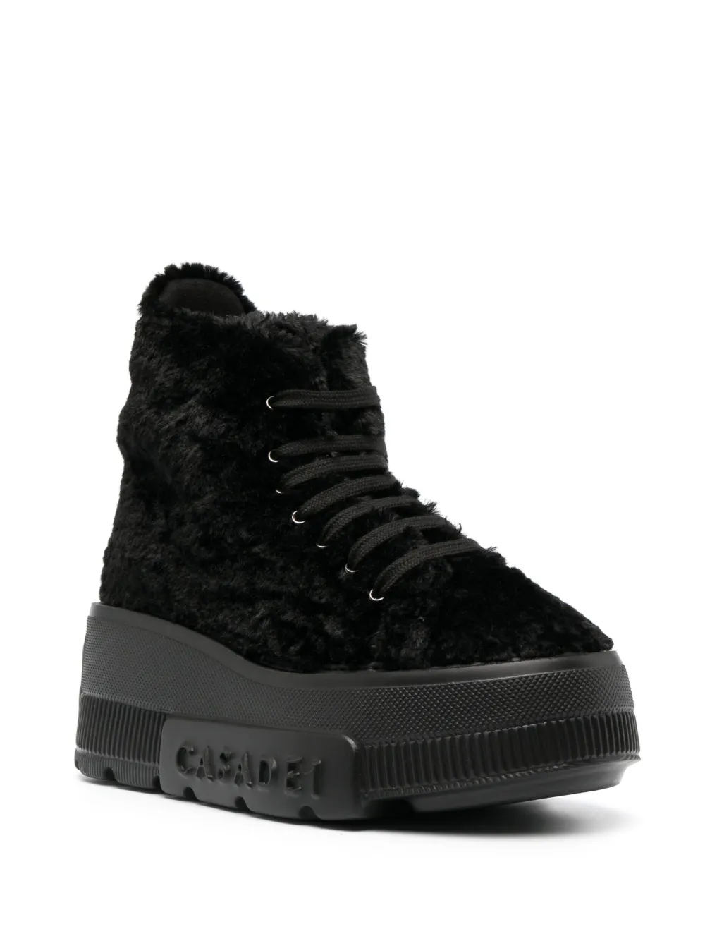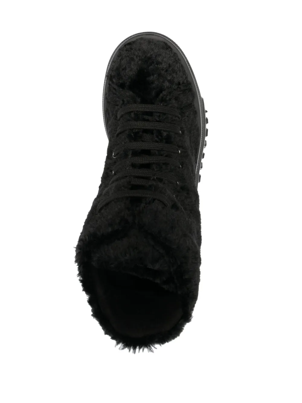 Черный, логотип на подошве, материал c флисовой текстурой, шнуровка спереди, закругленный носок, стелька с логотипом и плоская подошва.