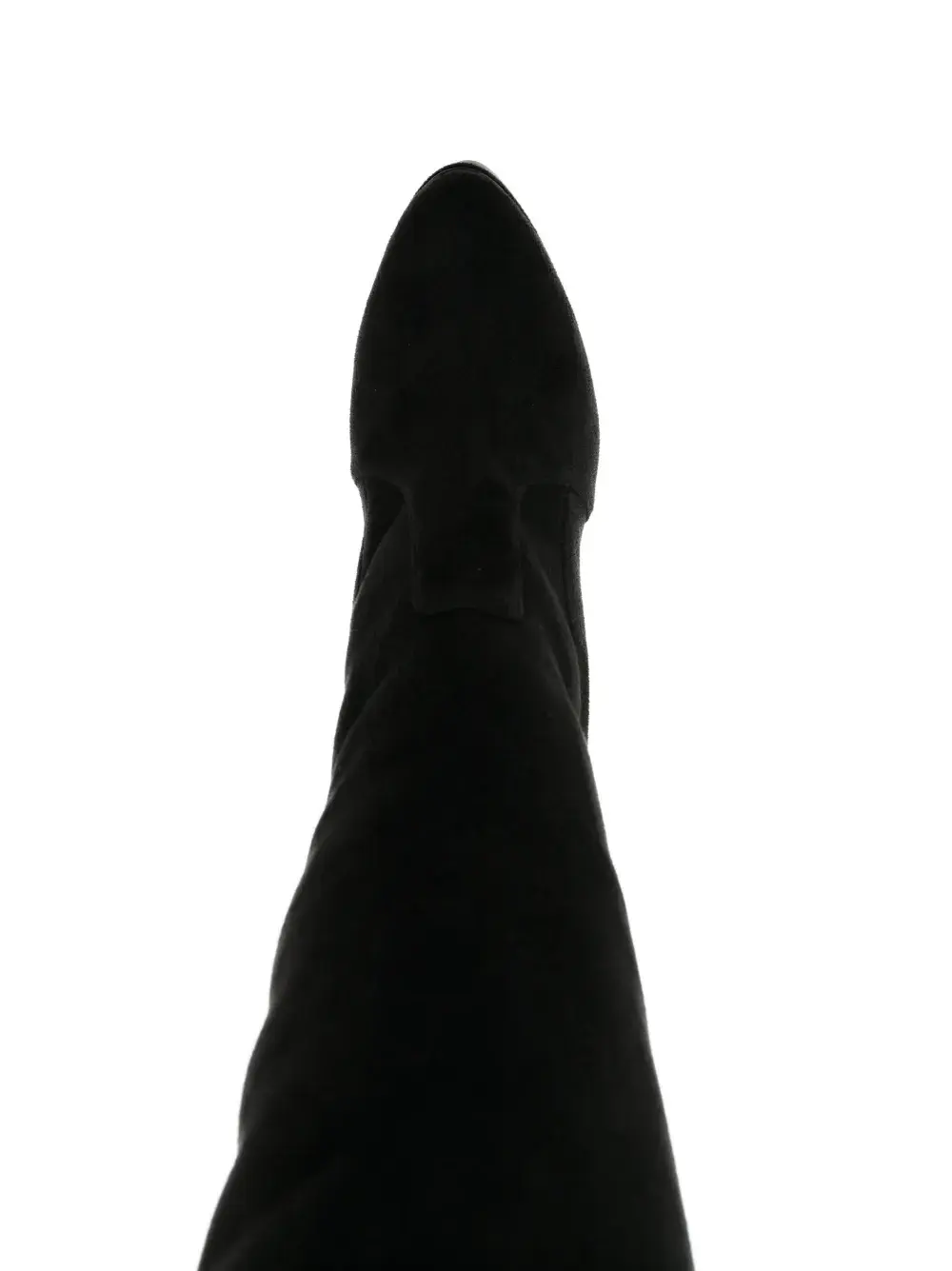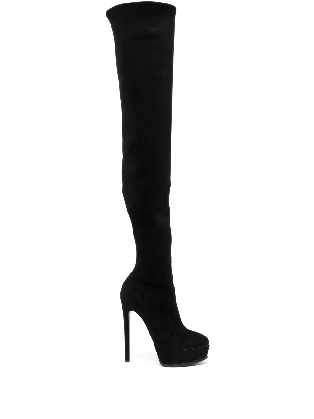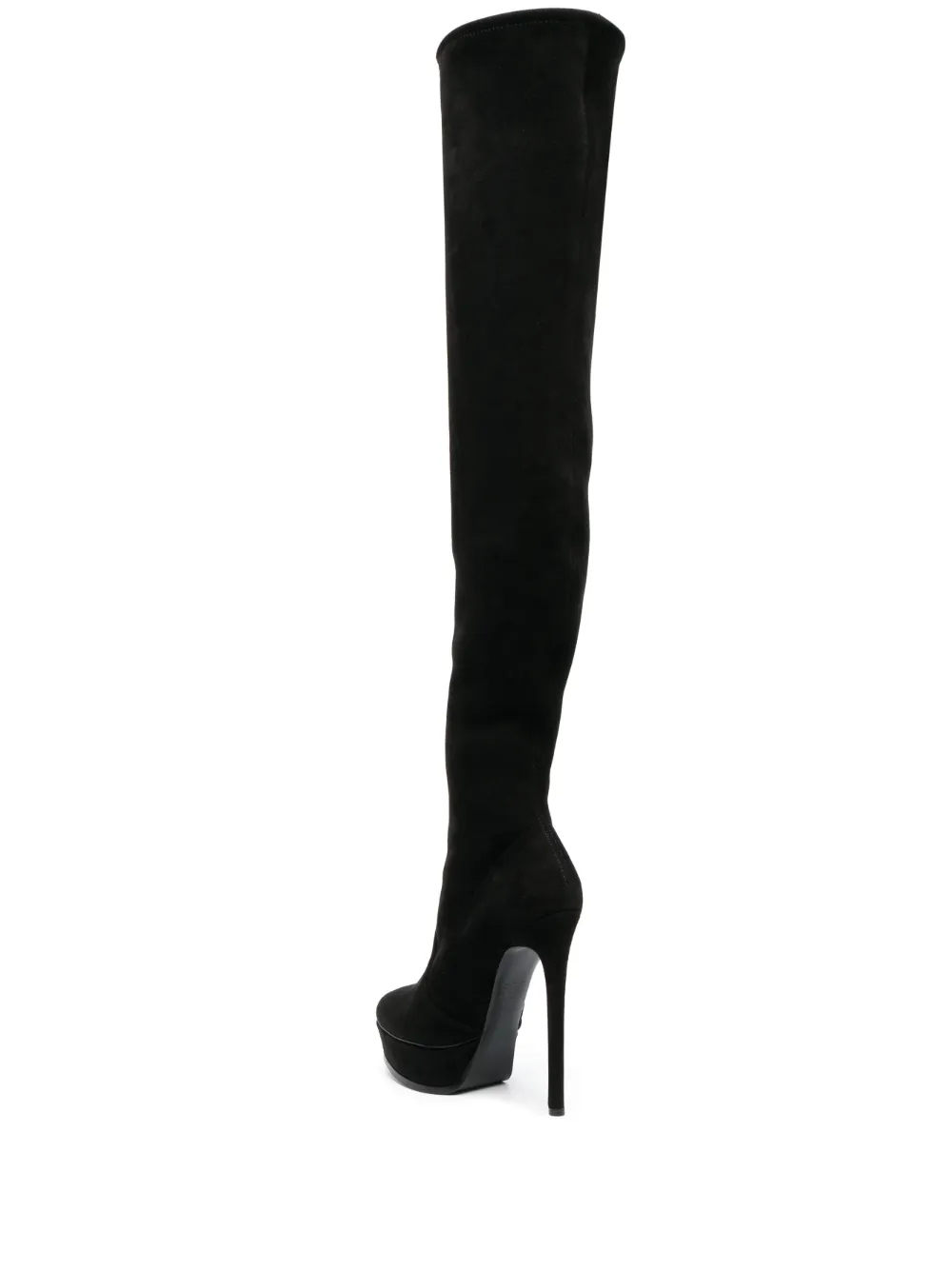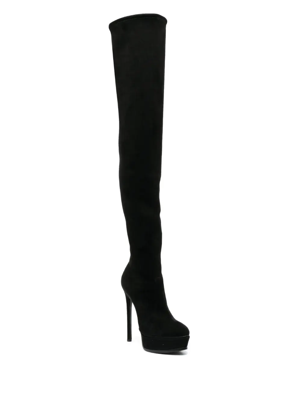 Черный, замша из телячьей кожи, модель без застежки, закругленный носок, длина выше колена, подошва на платформе и каблук на высокой шпильке.
